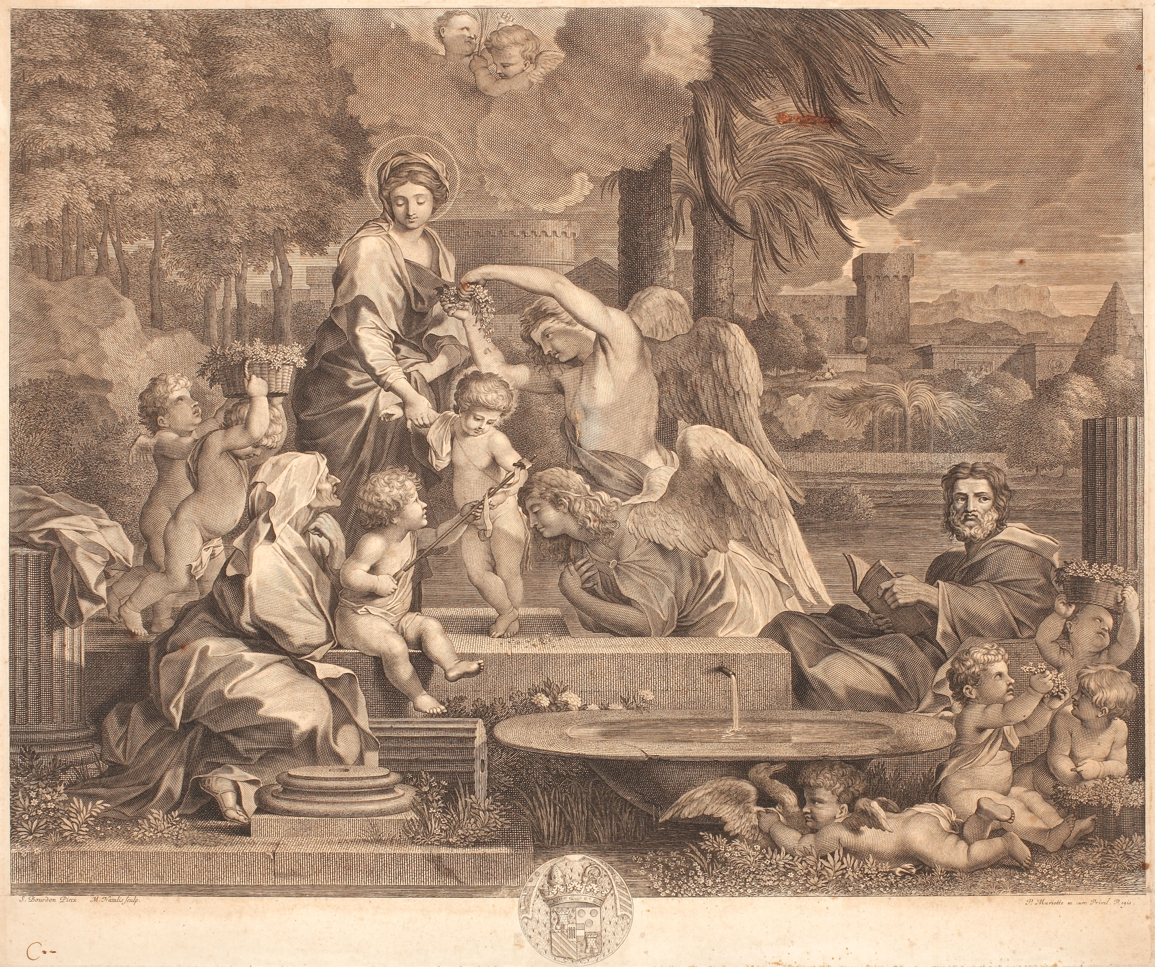 semnat și notat stânga jos, gravat, "M. Natalis sculp, S. Bourdon Pinx"; notată imprimeria dreapta jos, gravat, "P. Mariette ex. cum Print Regis"