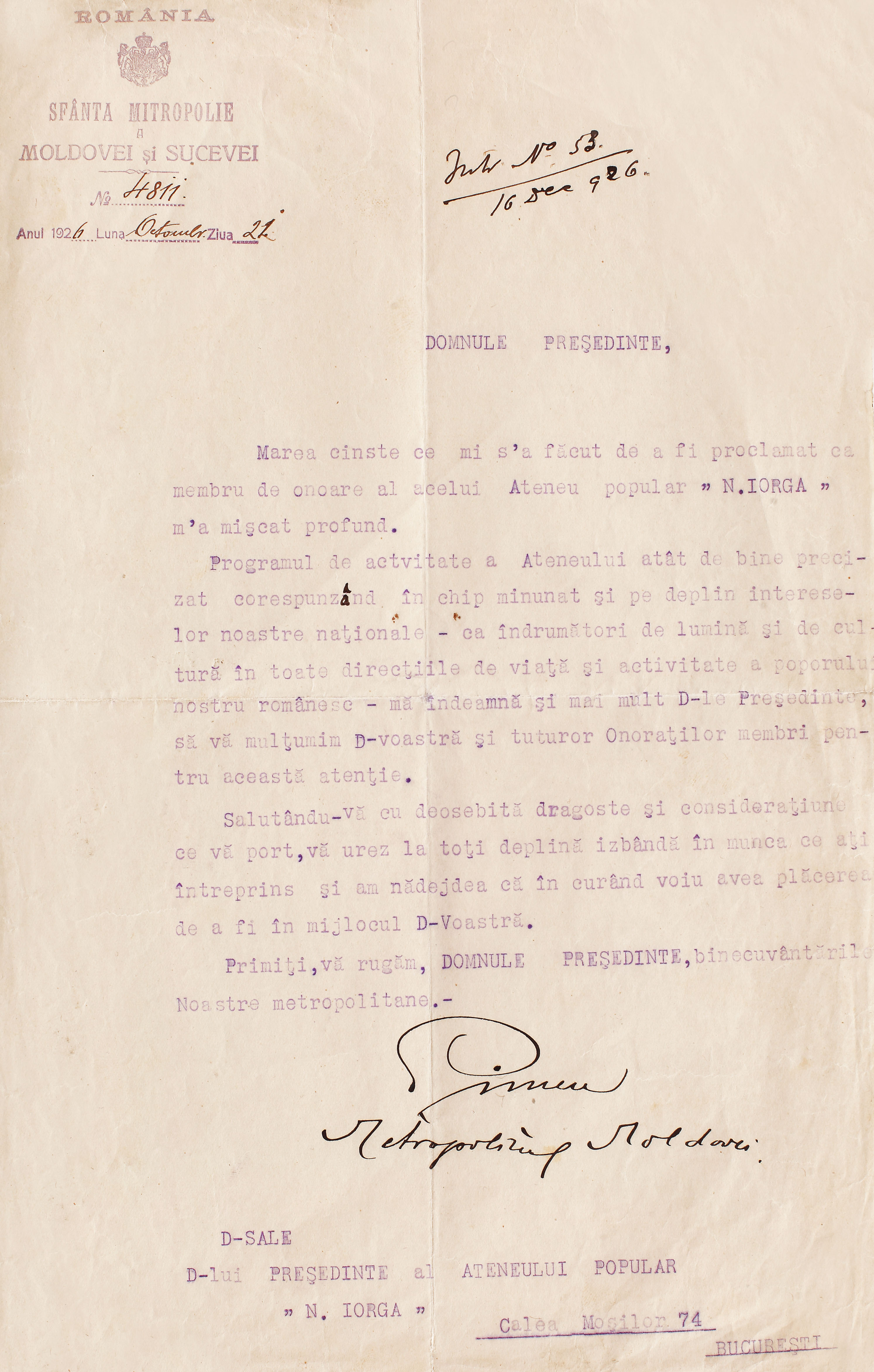 193. Scrisoare de mulţumire a Mitropolitului Moldovei Pimen Georgescu, 1926