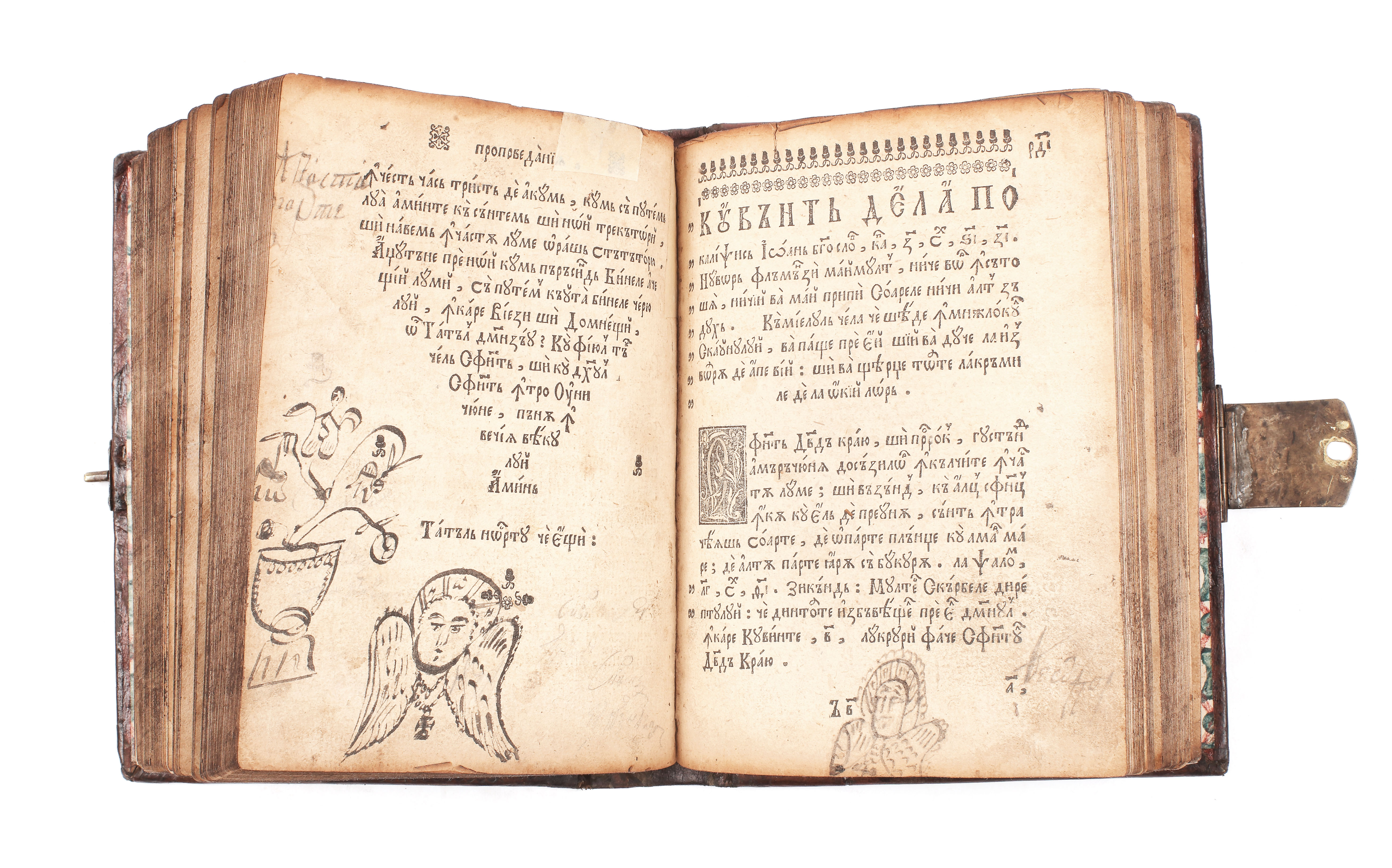 Mențiuni de colecție: a aparținut unui Theodor, care pe filele 113-114 desenează de mână vază cu flori și îngeri; pe fila 100 o notă manuscrisă păstrată fragmentar datată 1844