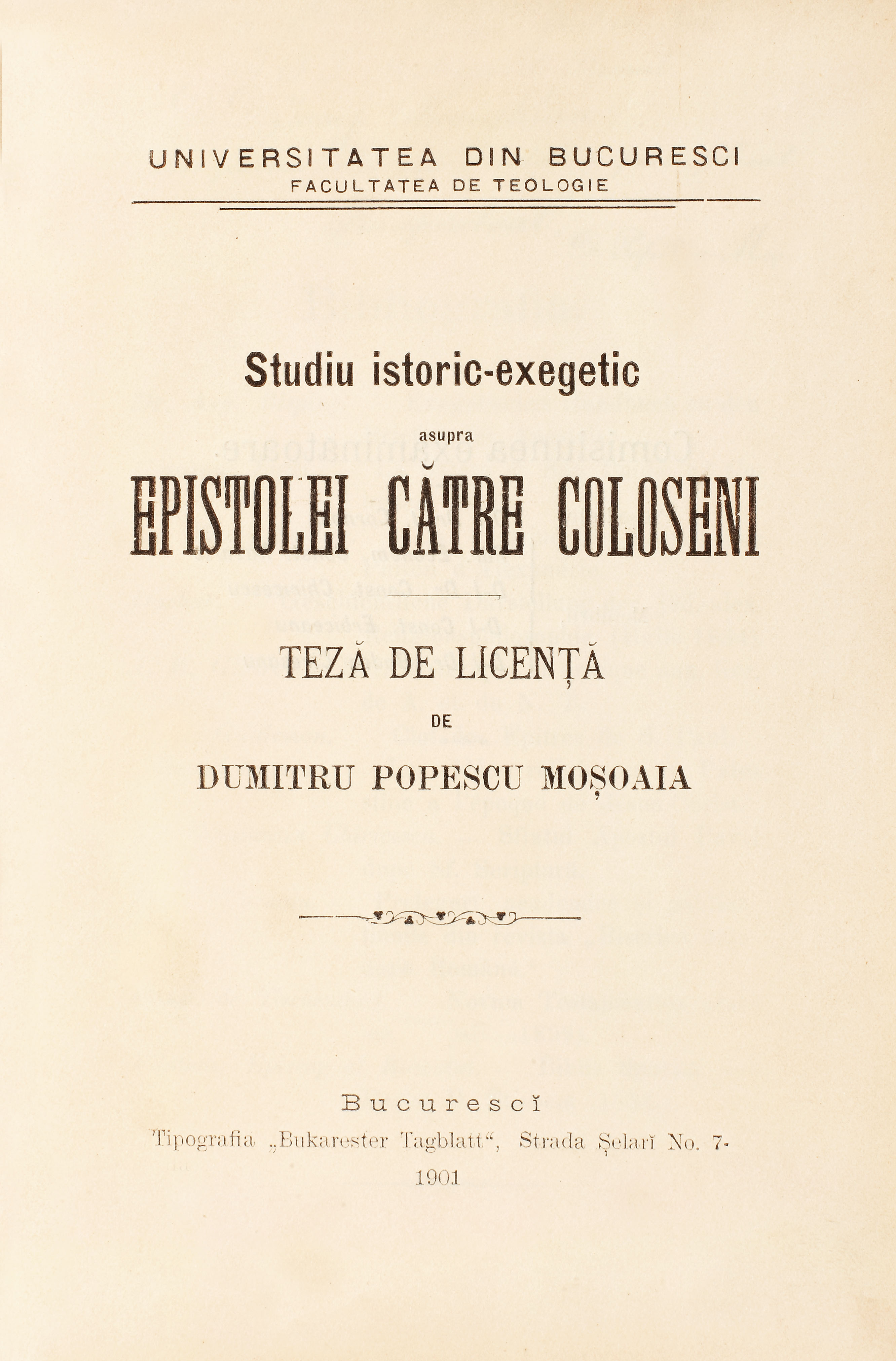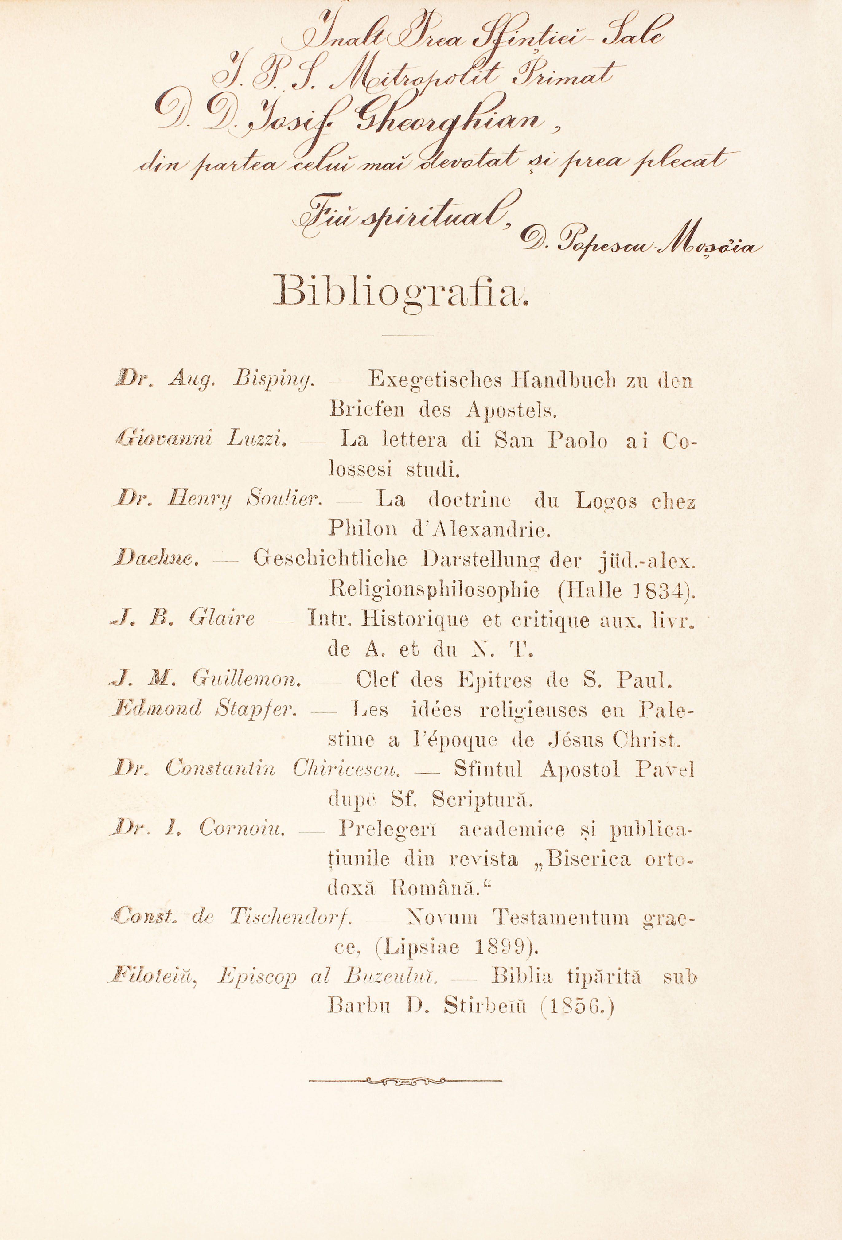 138. ”Studiu asupra Epistolei către Coloseni”, de Dumitru Popescu Moşoaia, Bucureşti, 1901, dedicat olograf mitropolitului Iosif Gheorghian