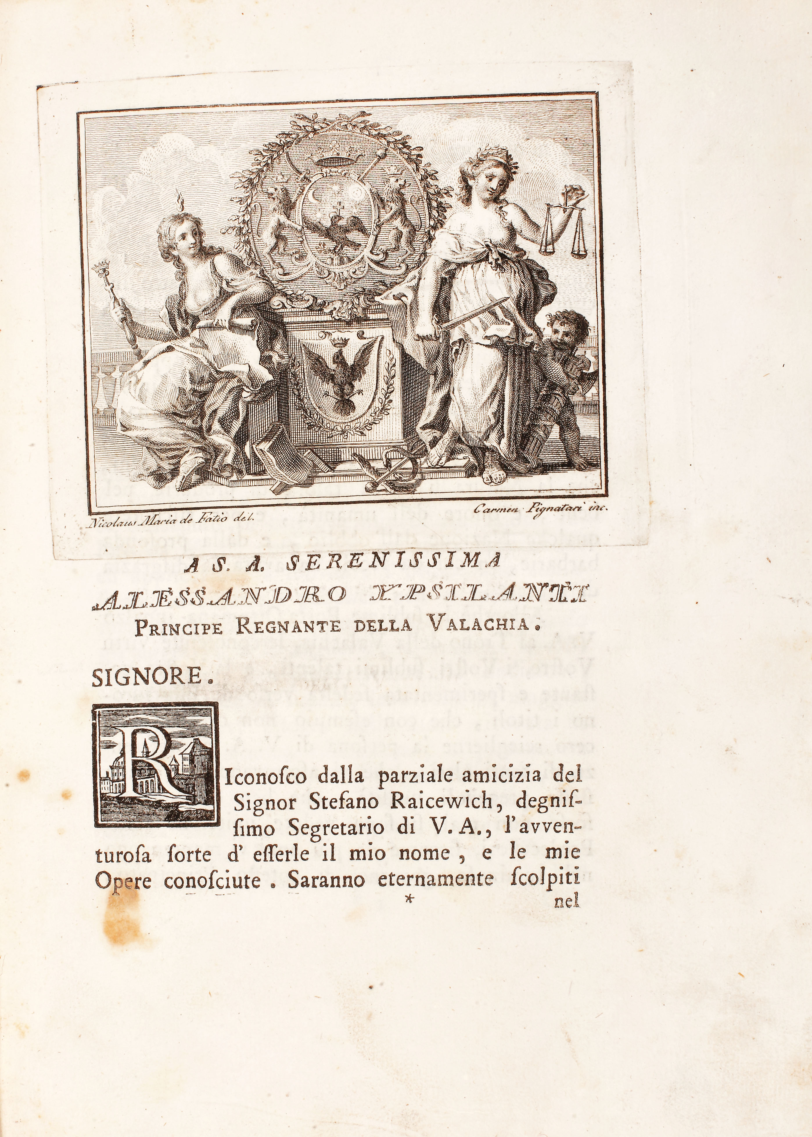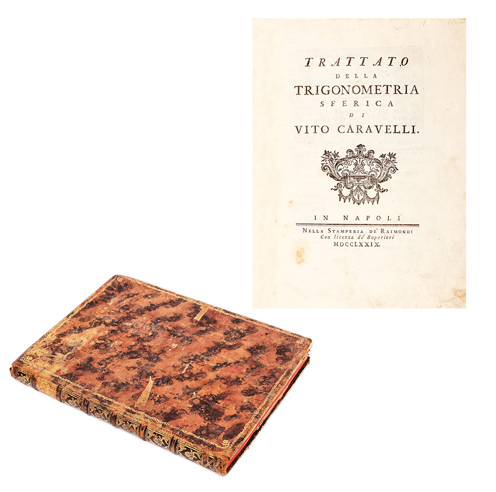Vito Caravelli a fost un preot matematician italian care a predat matematica la Academia Domnească din Bucureşti. Cartea prezentată aici începe cu o dedicaţie plină de laude către domnitorul Munteniei Alexandru Ipsilante. Acest tratat s-a folosit ca manual în şcolile din Bucureşti. Legătură de epocă, poate chiar originală, cu chenare şi cotor ornamentate cu aur. Pe cotor tipărit titlul pe etichetă.