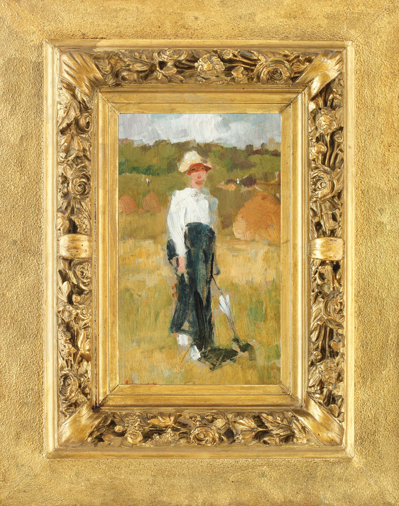 Tematica personajelor integrate în peisaj l-a preocupat pe Nicolae Grigorescu încă din perioada formării artistice de la Paris şi împrejurimile acestuia, perpetuându-se apoi pe parcursul întregii sale creaţii. În căutarea „culorii” celei mai potrivite, atras şi de viaţa artistică ce pulsa cu putere în afara mediului academic parizian inflexibil, Nicolae Grigorescu se simte unit în dragostea pentru natură cu ceilalţi artişti ce formau aşa-zisa „Şcoală de la Barbizon” (un sat situat la sud de Paris), loc de întâlnire, de discuţii aprinse şi de schimb de impresii. Pornind de la peisaje ca “personaje principale”, autonome, aşa cum erau ele concepute la Barbizon, din care nu lipseşte nici figura umană, desprinsă din lumea reală, cotidiană, Grigorescu, în fiecare etapă a creaţiei, continuă să elaboreze opere în care peisajele de la marginea satului, cu fân cosit, cu ţărani ce-şi munceau pământurile, cu turme de oi întorcându-se la amurg, de la păscut, erau toate privelişti asemănătoare cu atmosfera familiară de acasă. Între acestea se remarcă un număr impresionant de lucrări dedicate femeii. Surprinse în spaţiul domestic, în interioare, în grădini sau la câmp, torcând melancolice sau pur şi simplu dezgolite, în senzualitatea lor de contemplat, personajele feminine din opera lui Grigorescu ne apar de fiecare dată drept pretexte revelatoare pentru tratarea realistă a ansamblului naturii. De cele mai multe ori, titlurile tablouri- lor reprezentând femei indică statutul social al acestora („Ţărăncuţă”, „Logofeteasă”), activitatea pe care o desfăşoară („Cusând”, „Ţărancă torcând”), provenienţa geografică sau etnia („Munteanca”, „Ţiganca de la Ghergani”), vârsta („Bătrână la Barbizon”) etc. Într-o paletă cromatică bogată, dar calmă, cu tuşe largi şi rapide, culori ce reflectă fidel lumina specifică a naturii, opera „Femeie cu umbrelă” se remarcă prin preţiozitatea tonurilor de galben uscat, ocru-verde şi verde-brun, specifice unei perioade deosebit de prolifice pentru creaţia sa, perioada bretonă. Din întinderea câmpului, la marginea satului, se detaşează, în tonalităţi neutre de alb şi negru, silueta elegantă a unei femei cu umbrelă. În mijlocul naturii, figura plăcută şi gracilă a femeii dobândeşte un farmec aparte, integrându-se perfect cadrului. Vestimentaţia, expresie a bunului gust, subliniază nota de senzualitate concentrată mai ales în zona curbelor contrastante realizate de linia capului şi a gâtului şi de cea a şoldurilor. (M.N.)