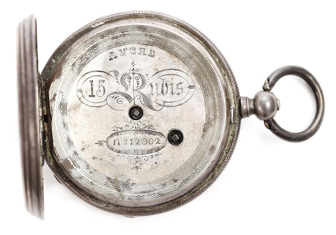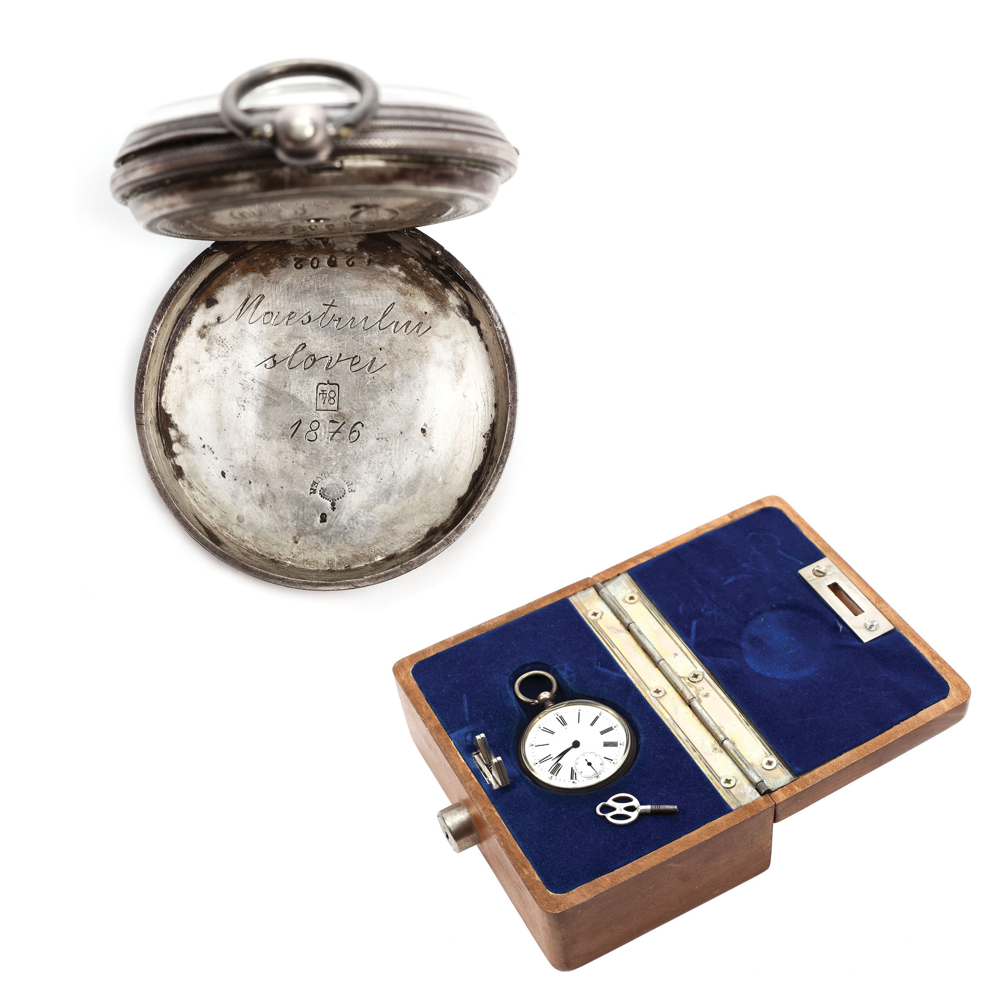 200. Ceas de buzunar, din argint, ce a aparţinut poetului Mihai Eminescu, cu dedicaţie din partea junimiştilor, datat 1876