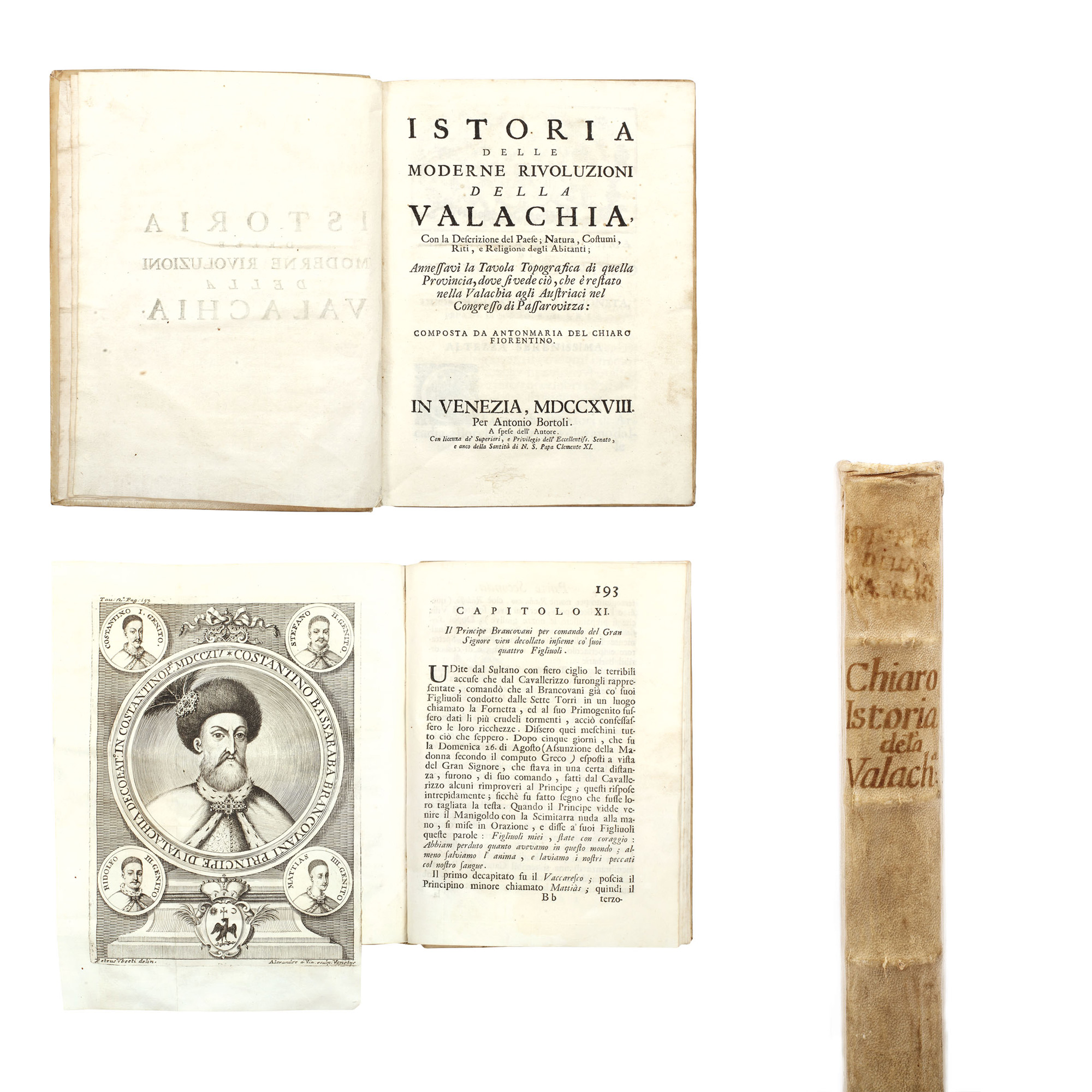 197. "Istoria revoluțiilor moderne din Valahia", de Anton-Maria del Chiaro, Veneţia, 1718, conține gravura originală a lui Constantin Brâncoveanu și a copiilor săi, realizate de Alexander a' Via, piesă extrem de rară, de colecție