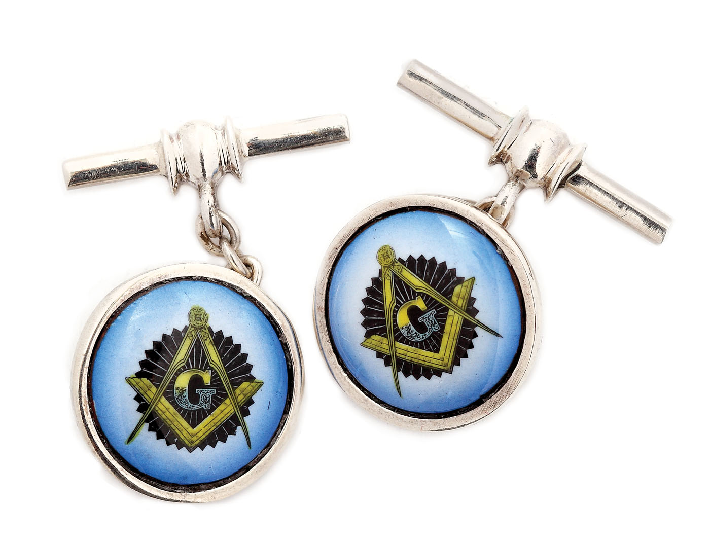 203. Pereche de butoni, din argint, decorată cu însemne masonice
