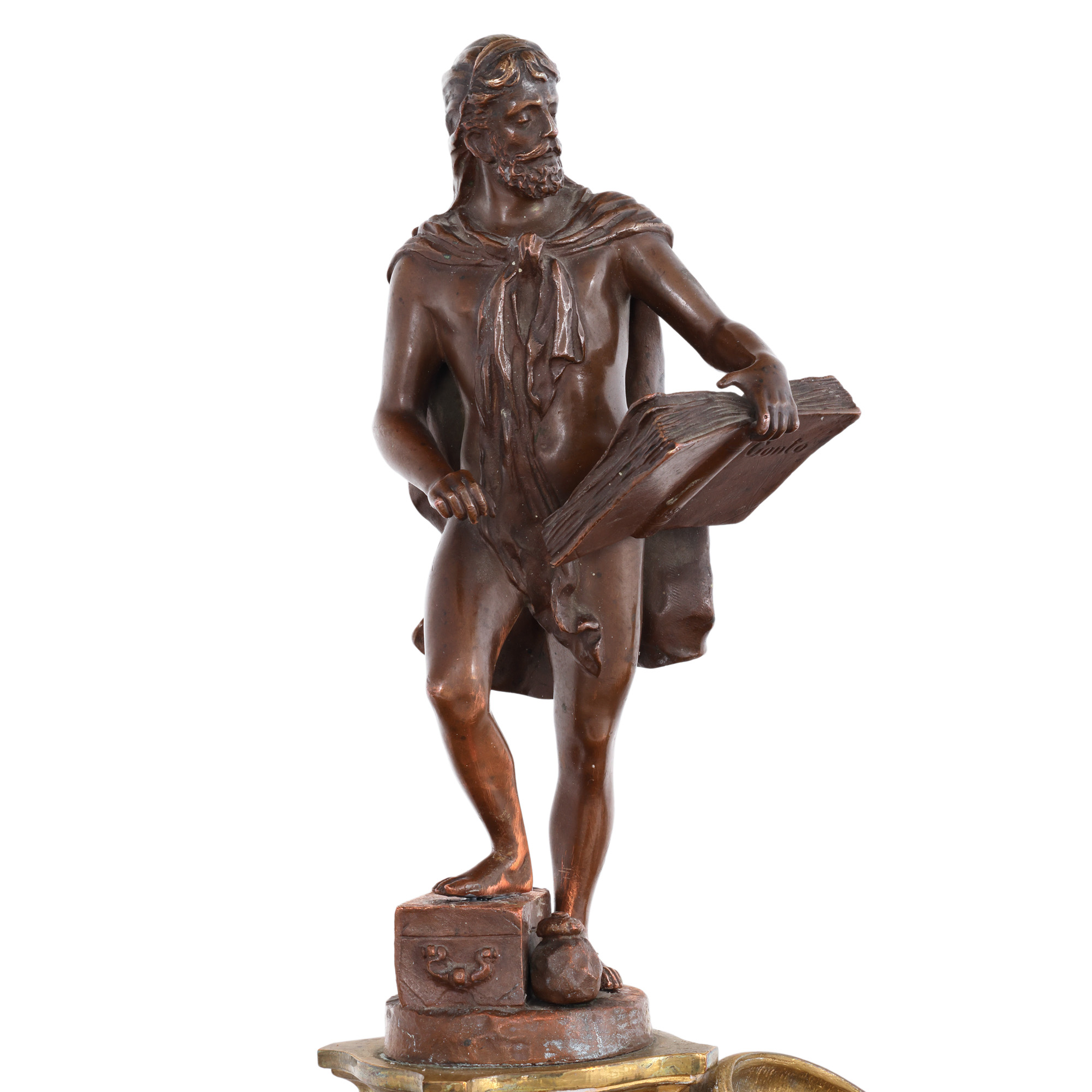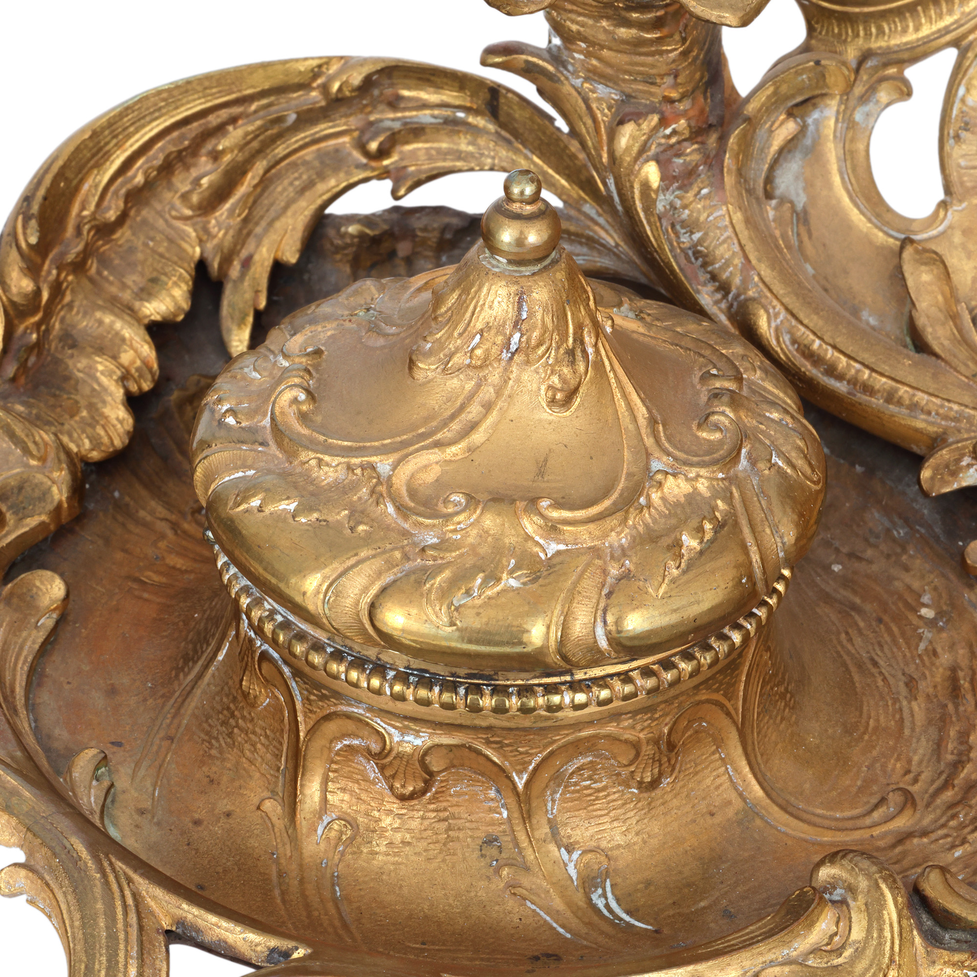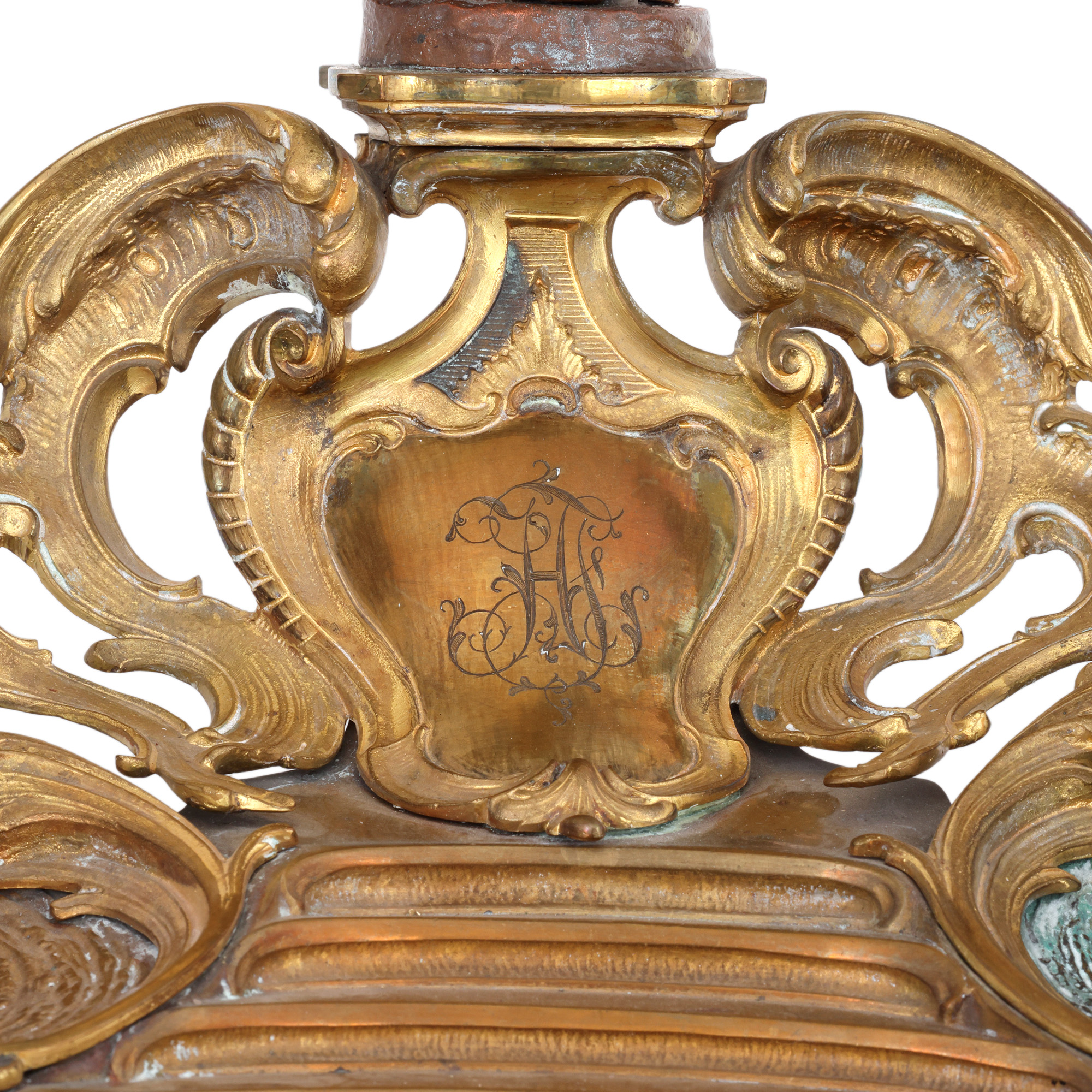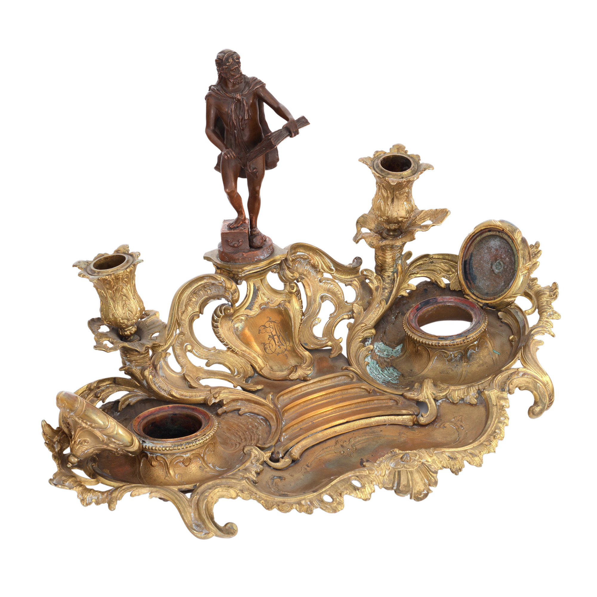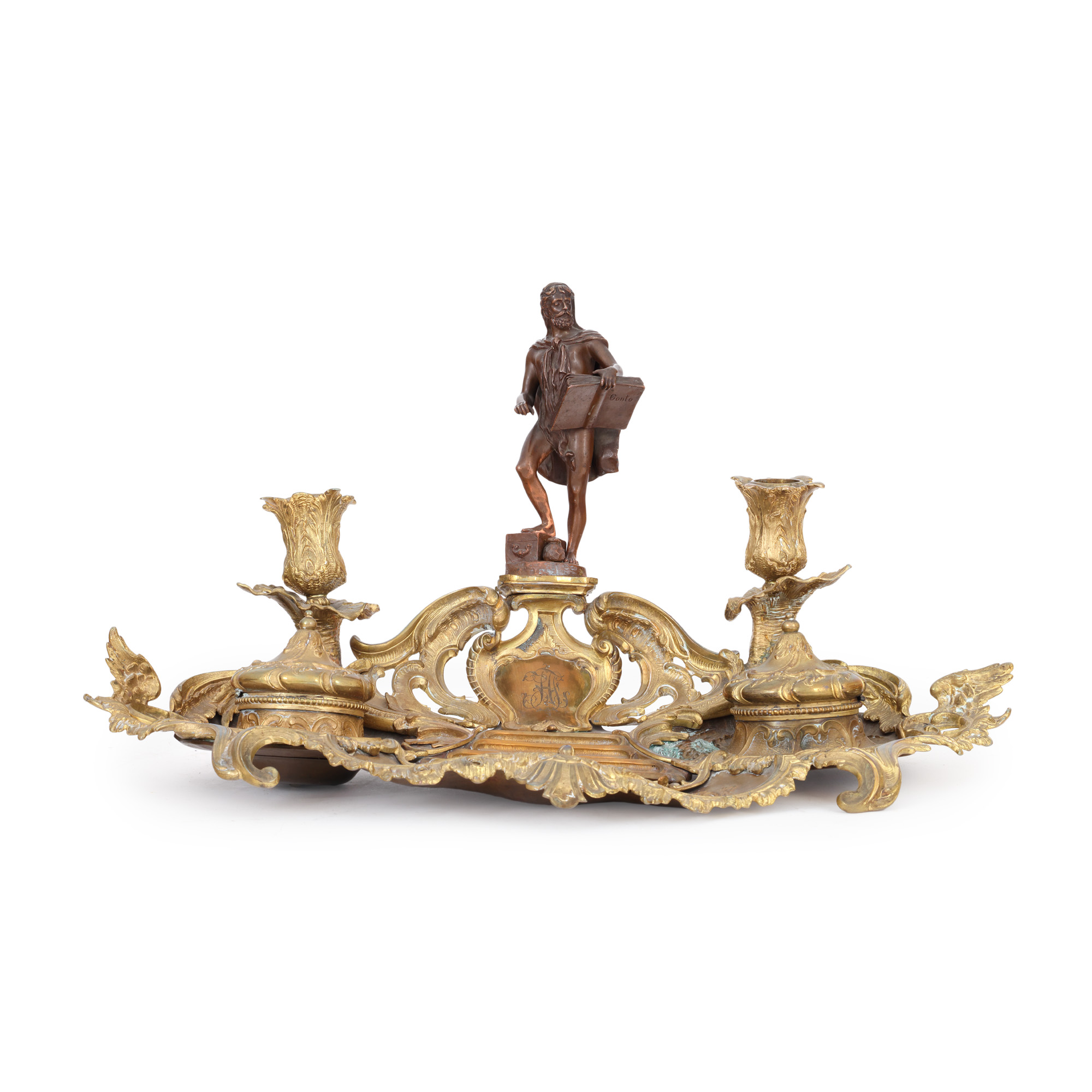 84. Encrieră din bronz aurit, decorată cu statuetă și monogramă ”HT”, cca. 1900
