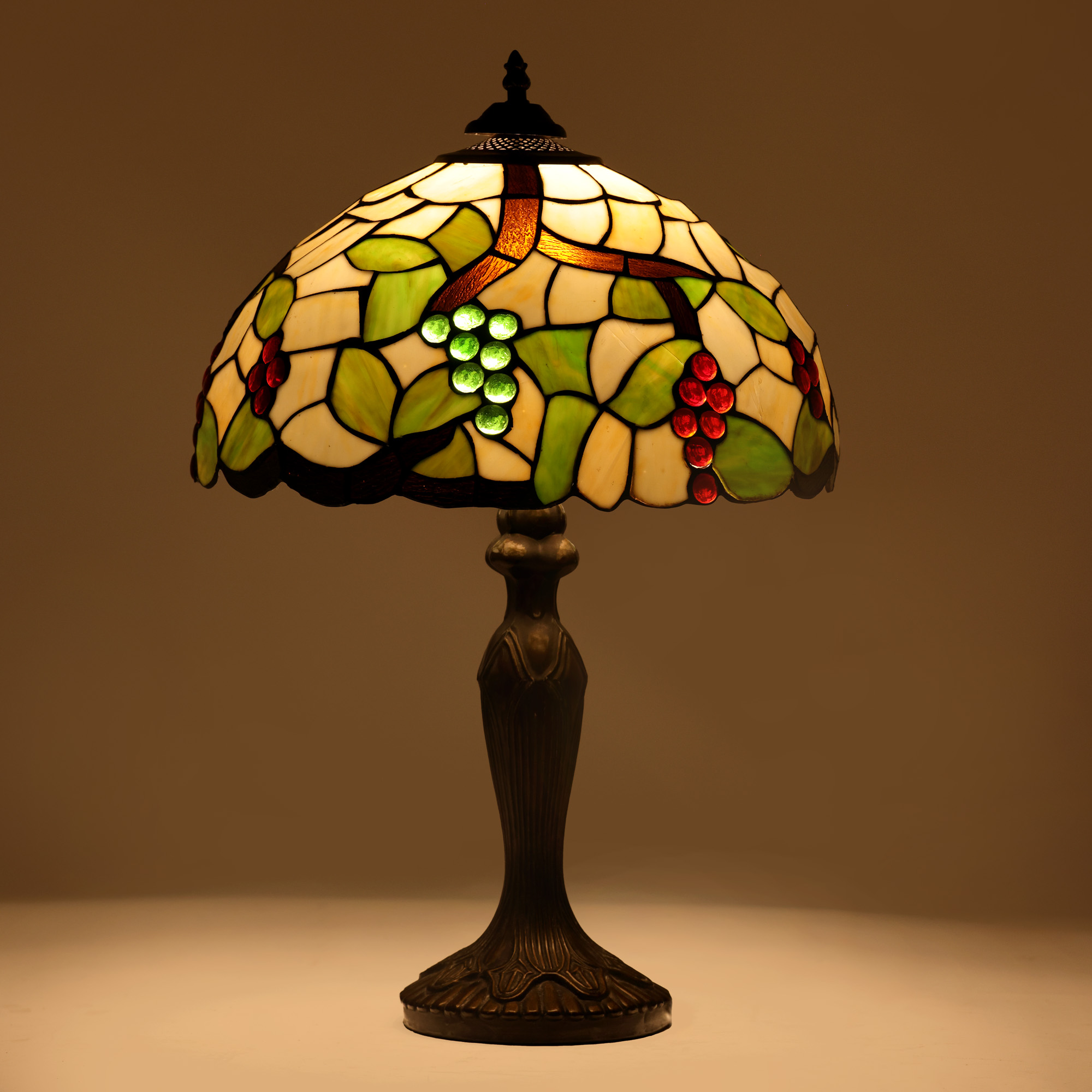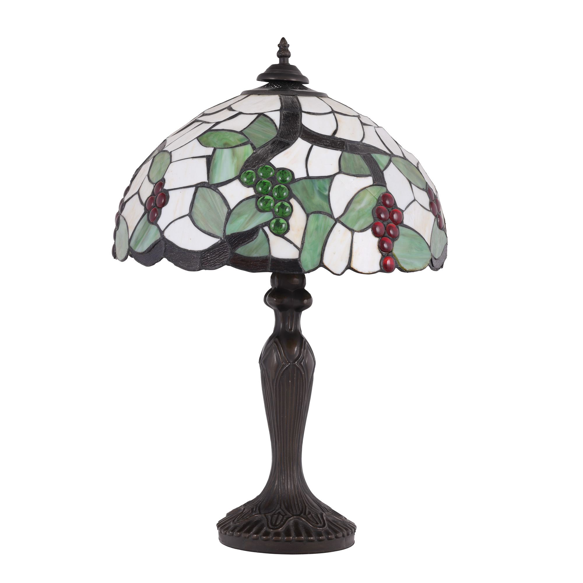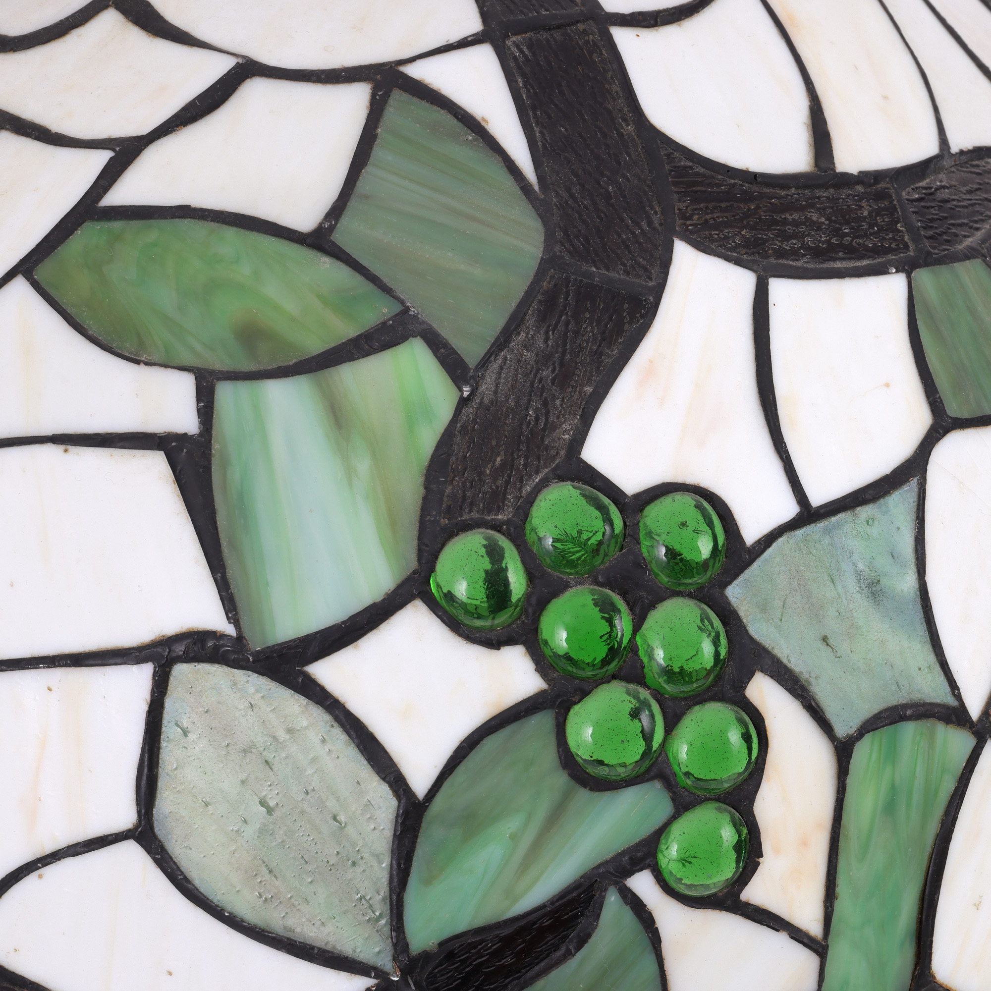 67. Lampă de birou în manieră Tiffany, cu bază din bronz patinat, ilustrând viță de vie