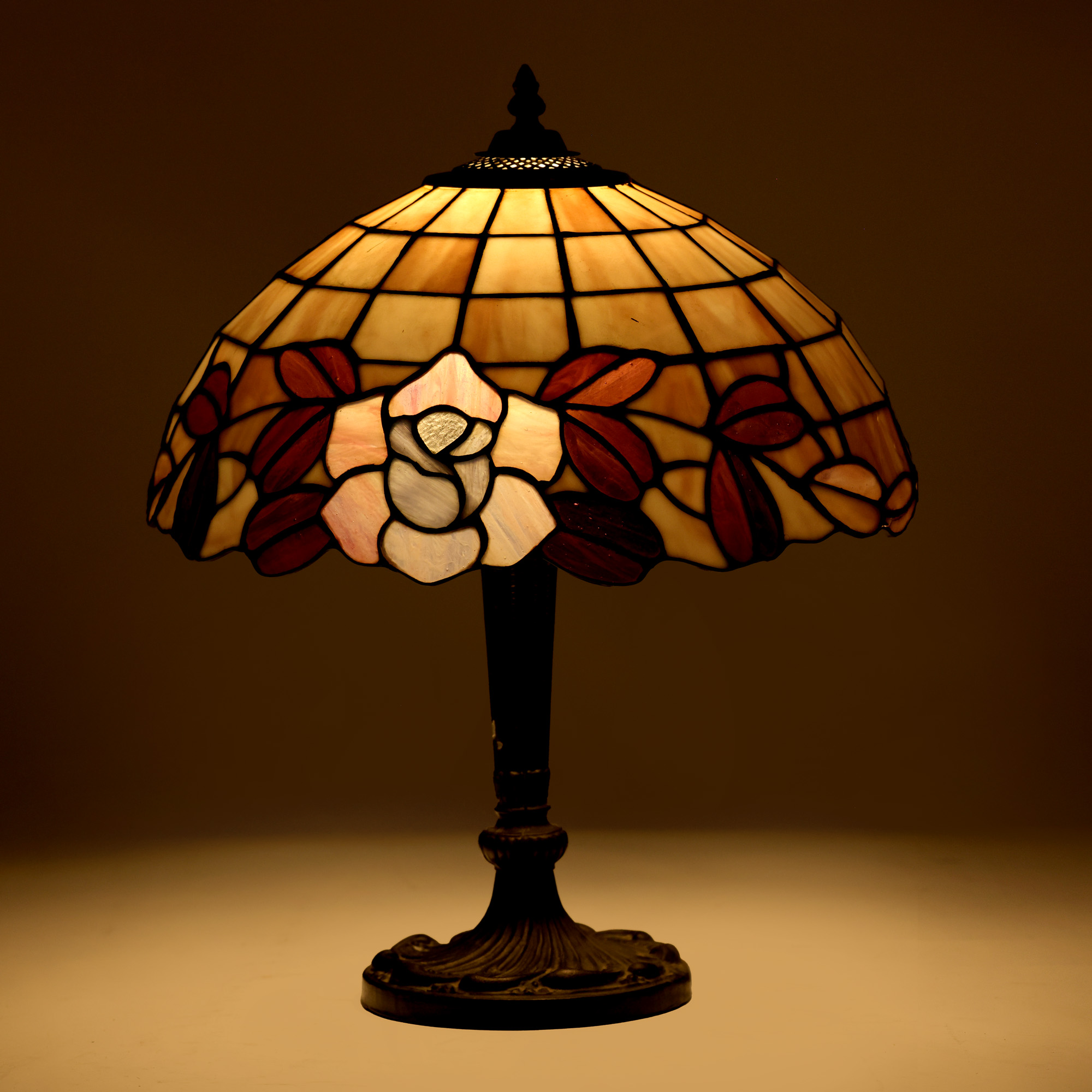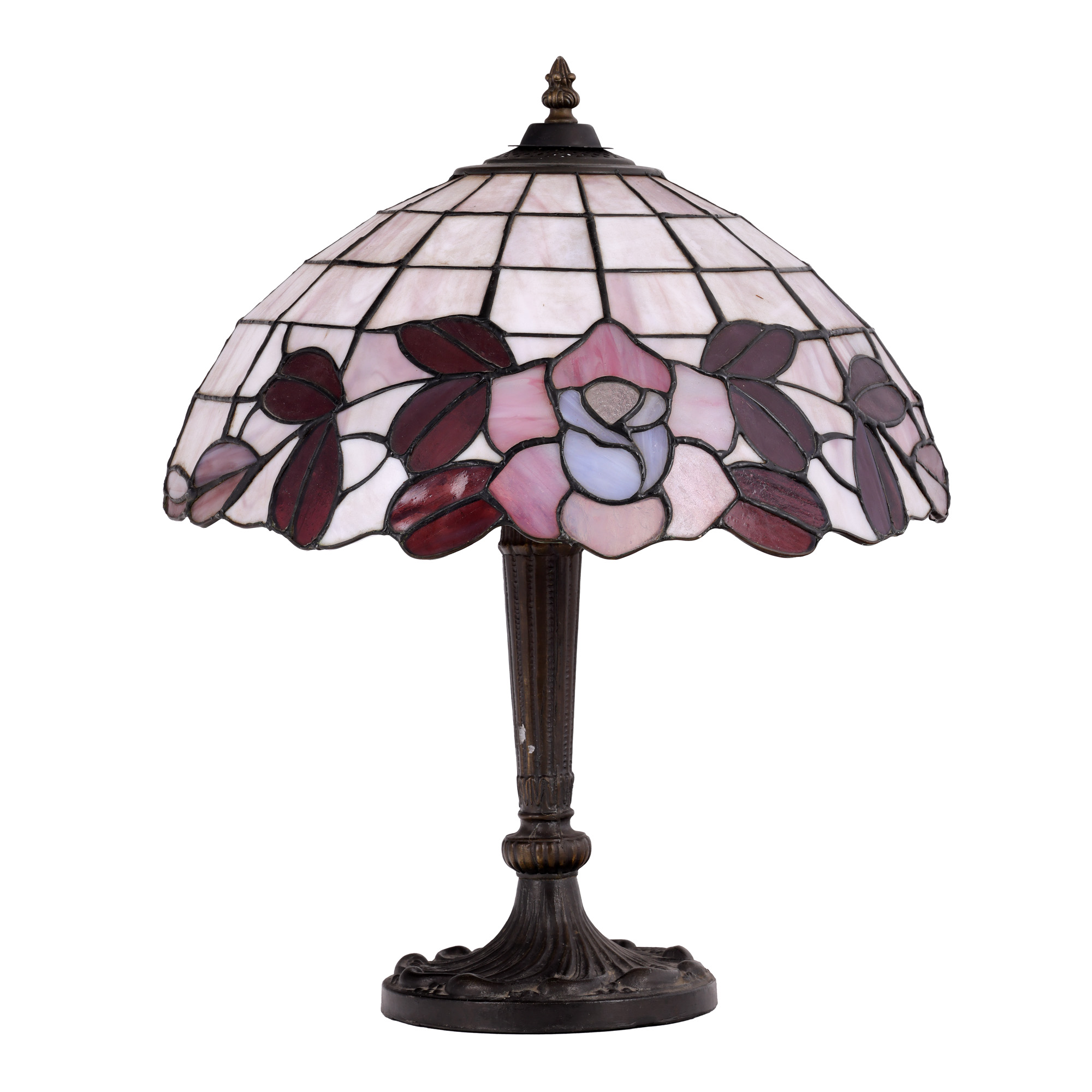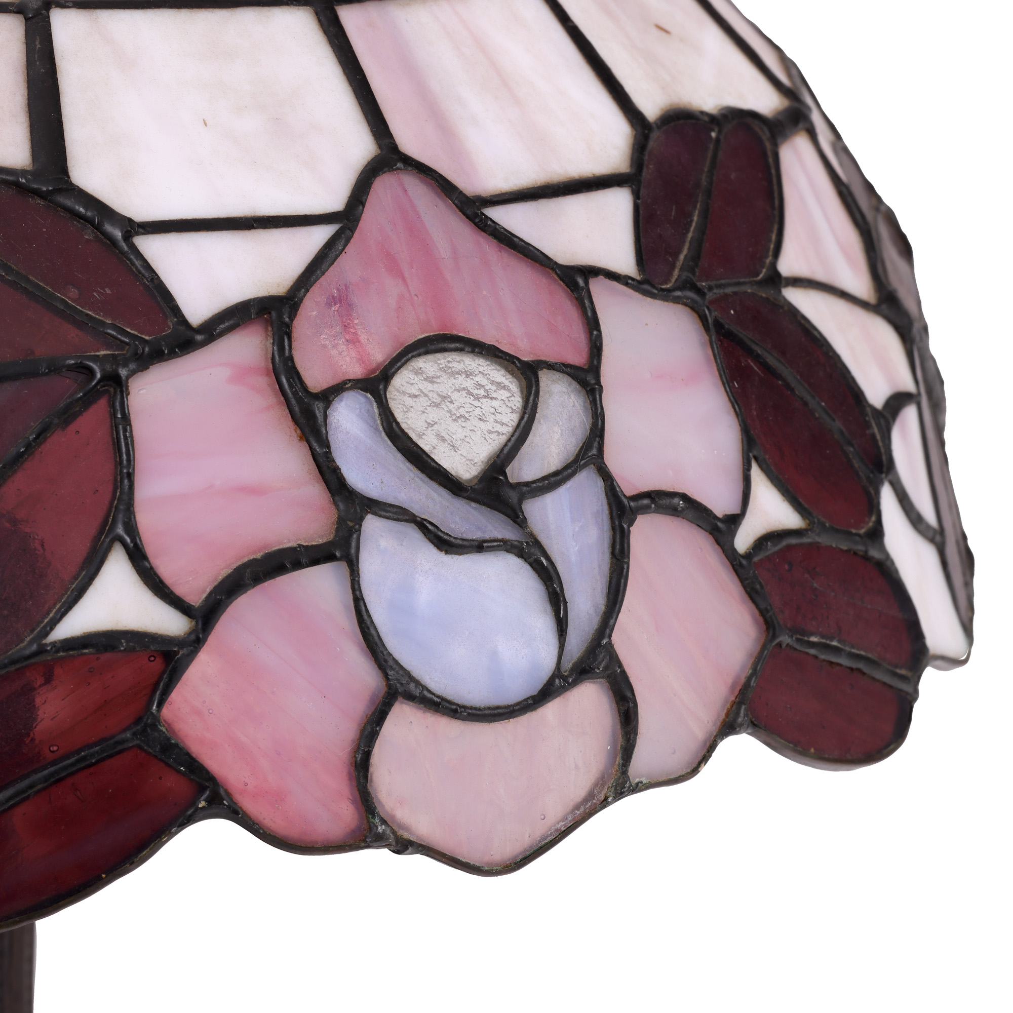 69. Lampă pentru birou în manieră Tiffany, cu bază din bronz patinat, ilustrând trandafiri