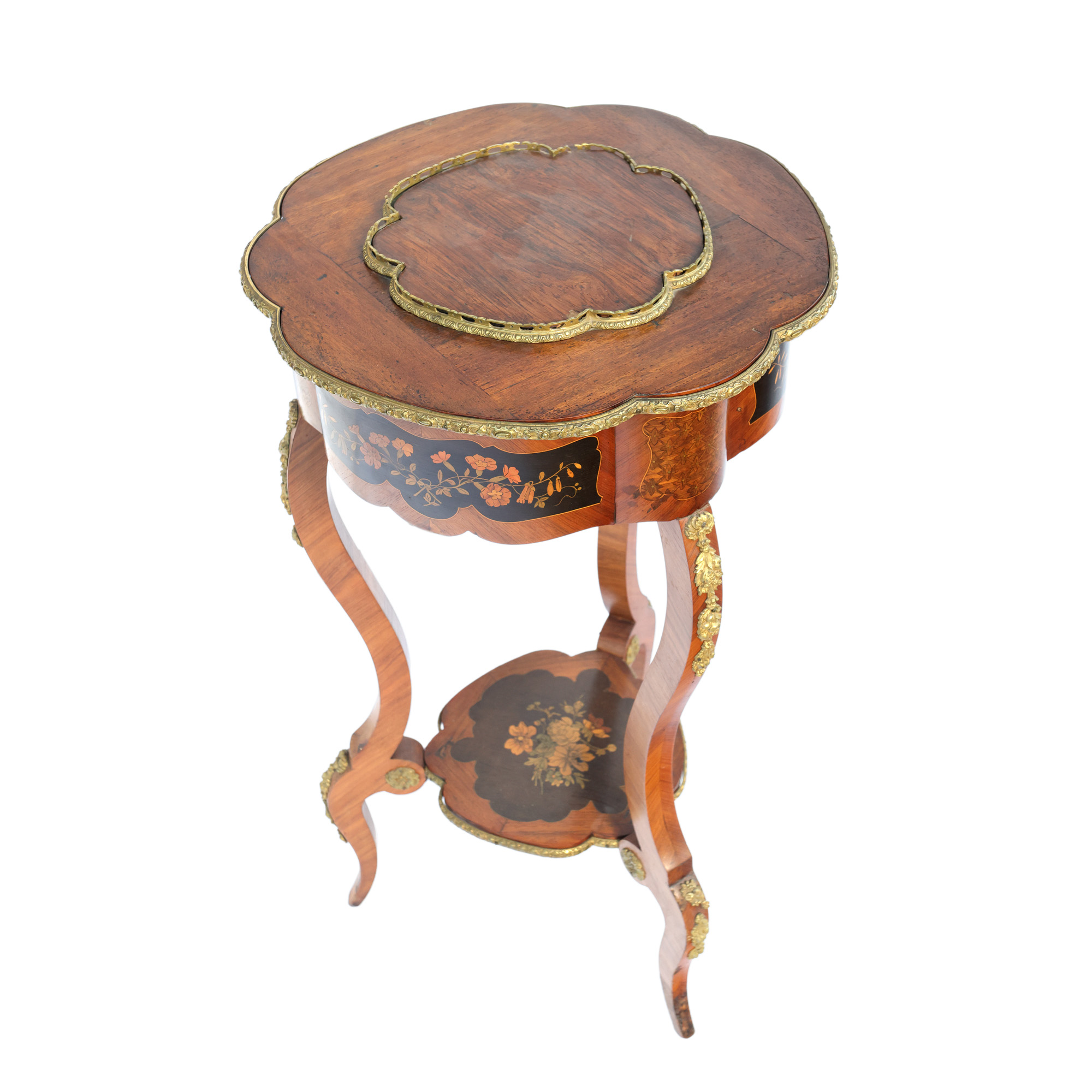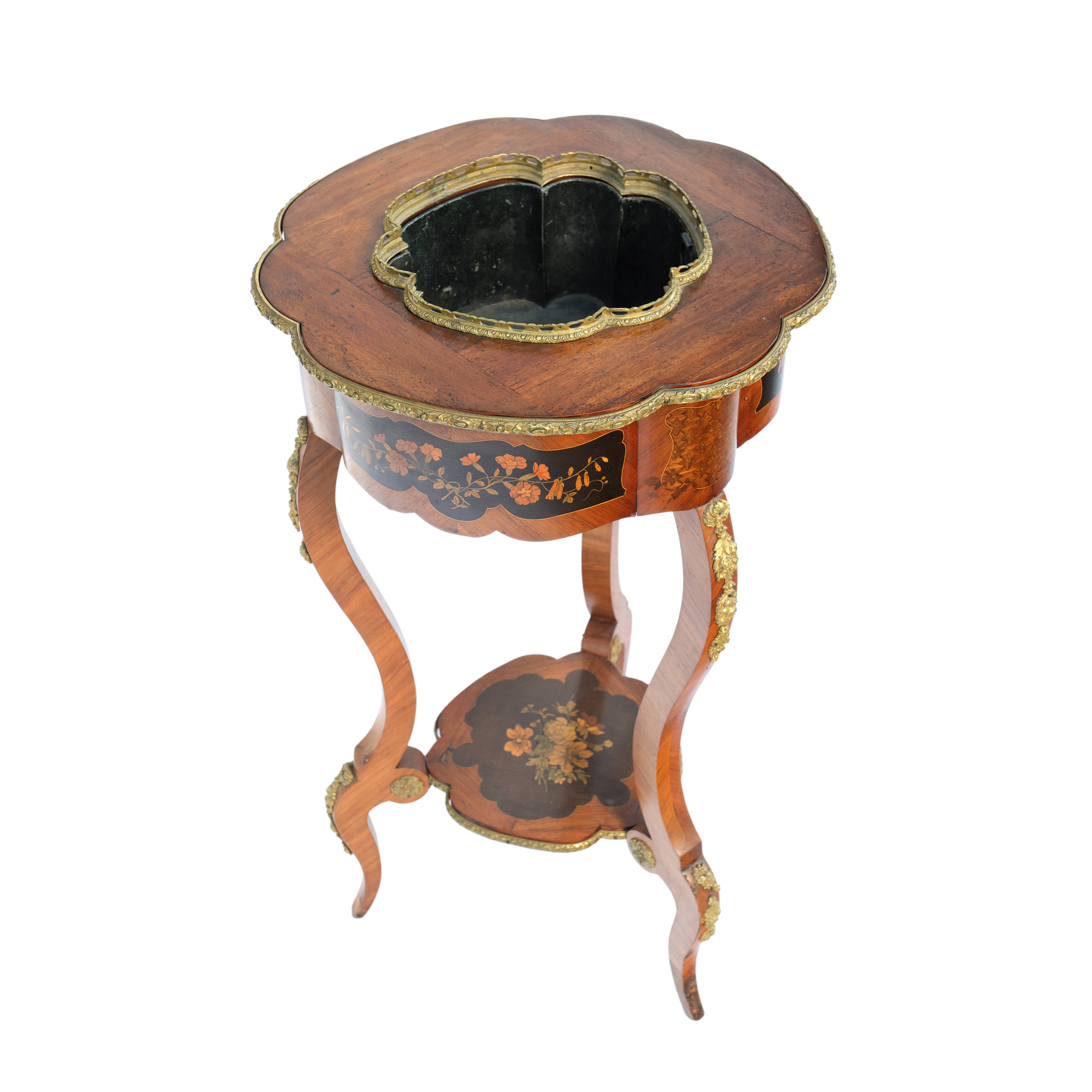 76. Măsuță cu jardinieră încorporată, în stil Napoleon III, decorată cu intarsii și ornamente din bronz cca. 1930-1940