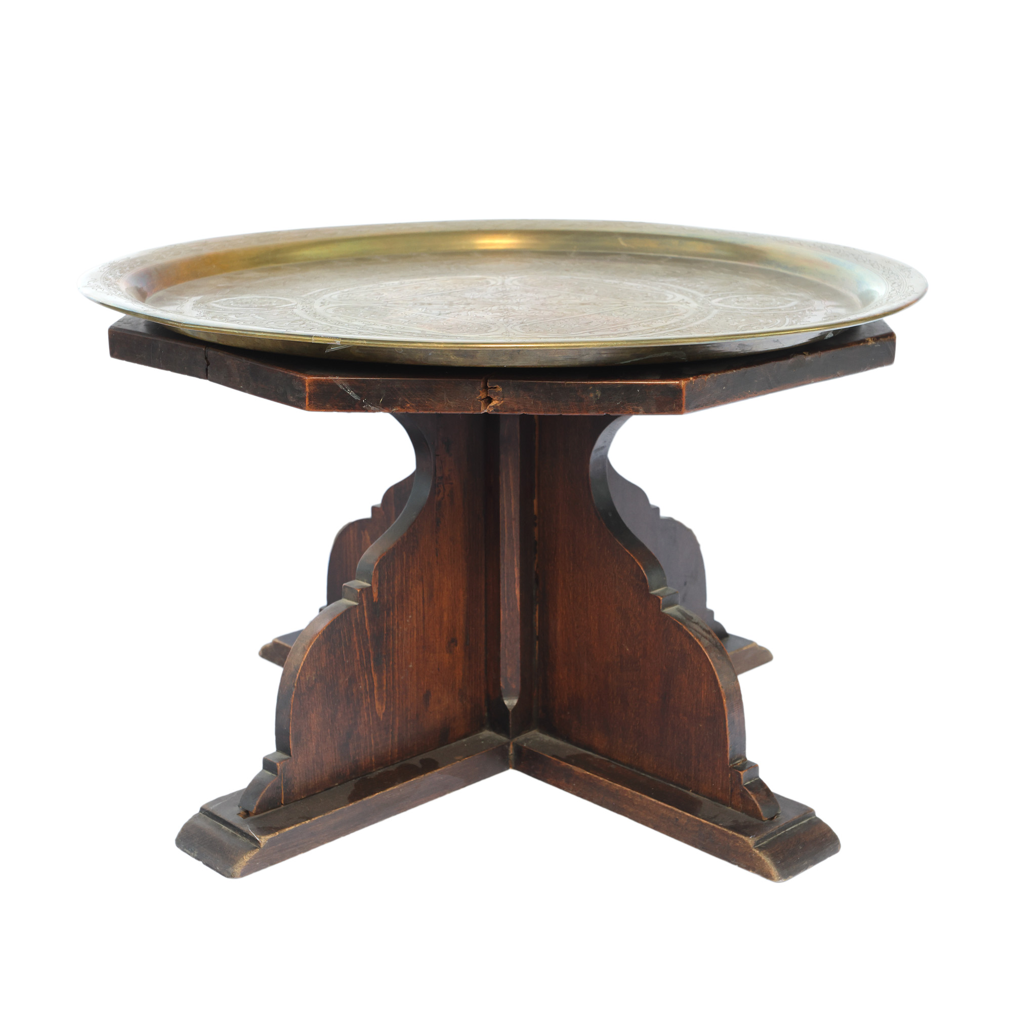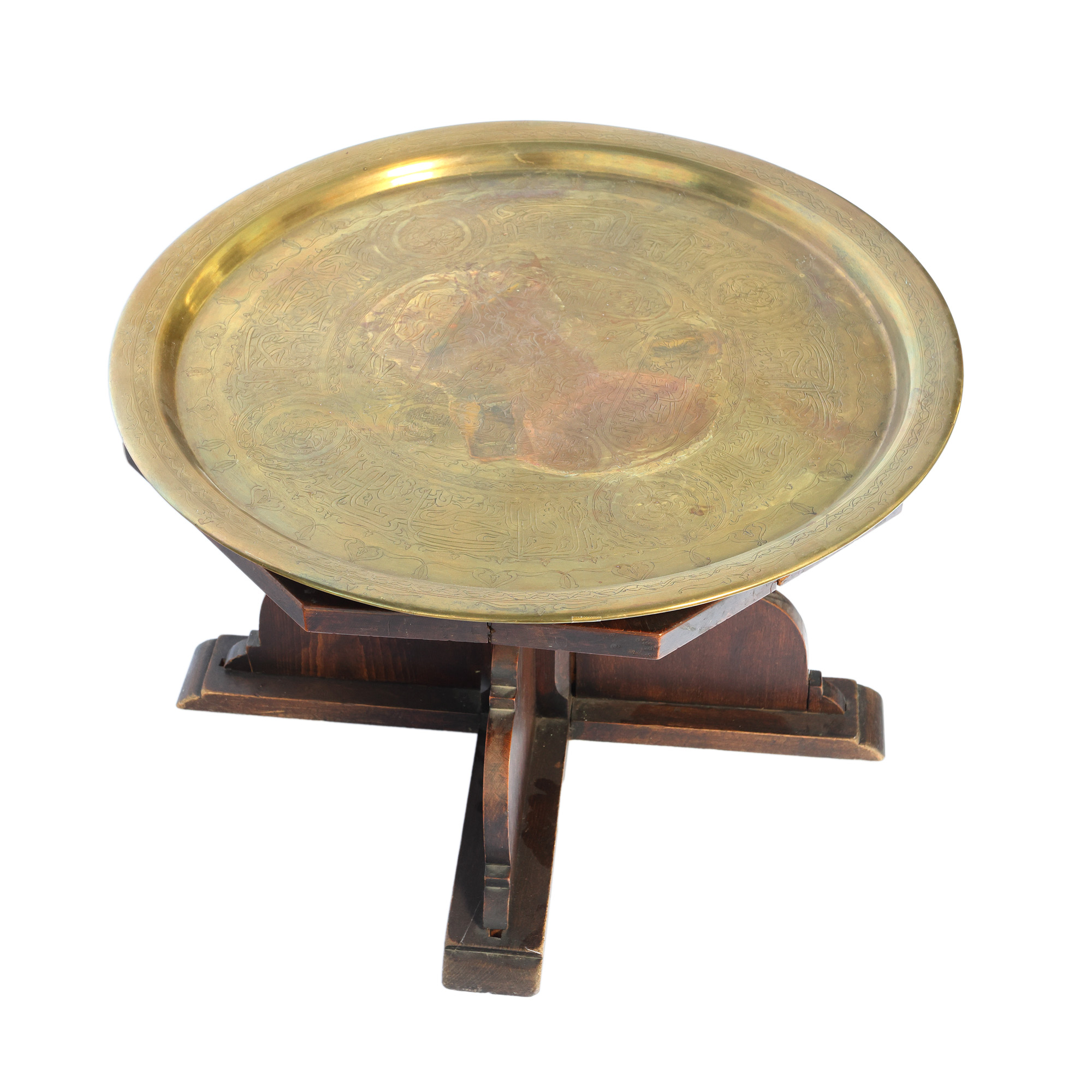 53. Tavă din alamă și suport din lemn, decorată în stil oriental, sfârșitul sec. XIX