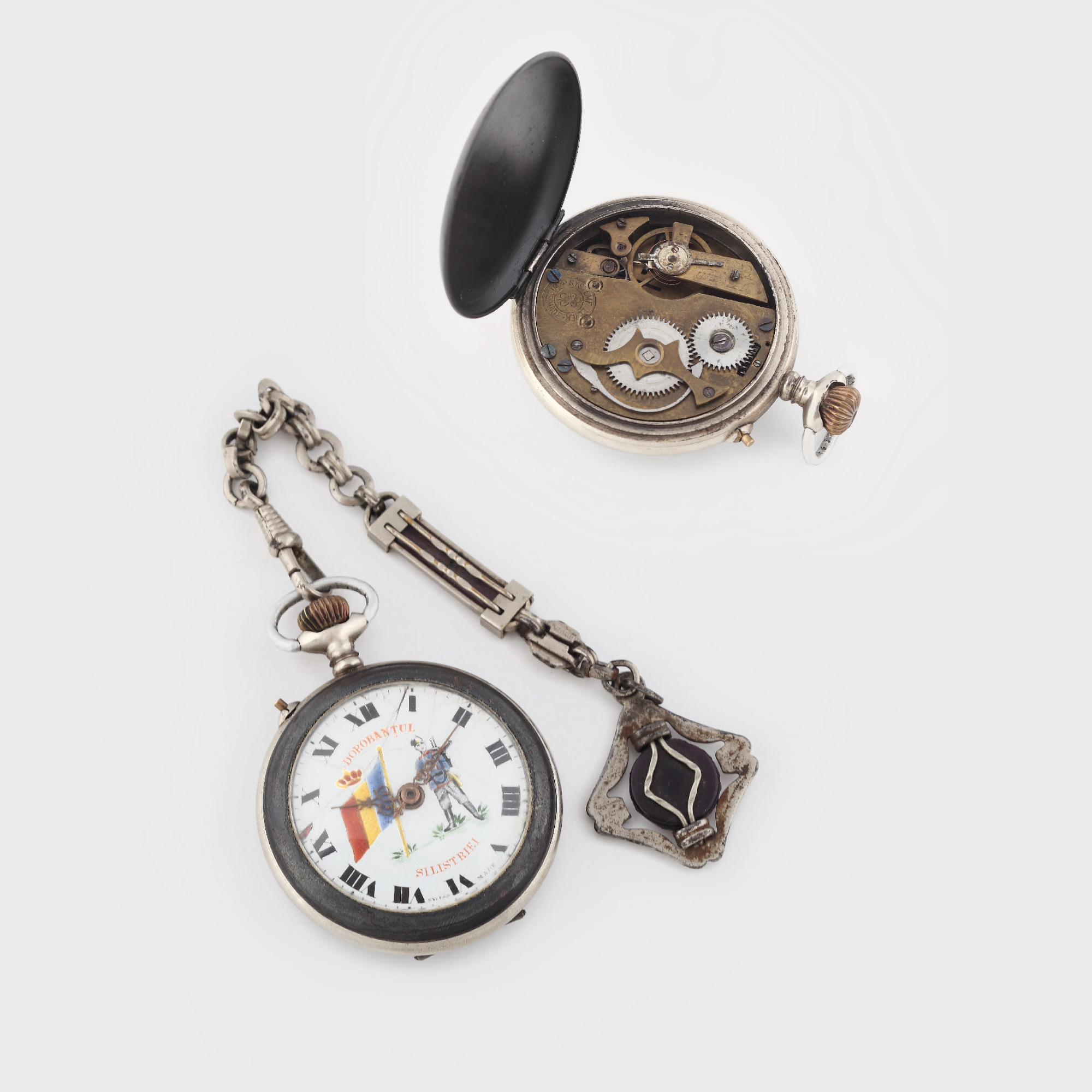93. Ceas Roskopf, ediția "Dorobanțul Silistriei", de buzunar, simbolurile Corpului de Grăniceri, piesă decorativă, de colecție