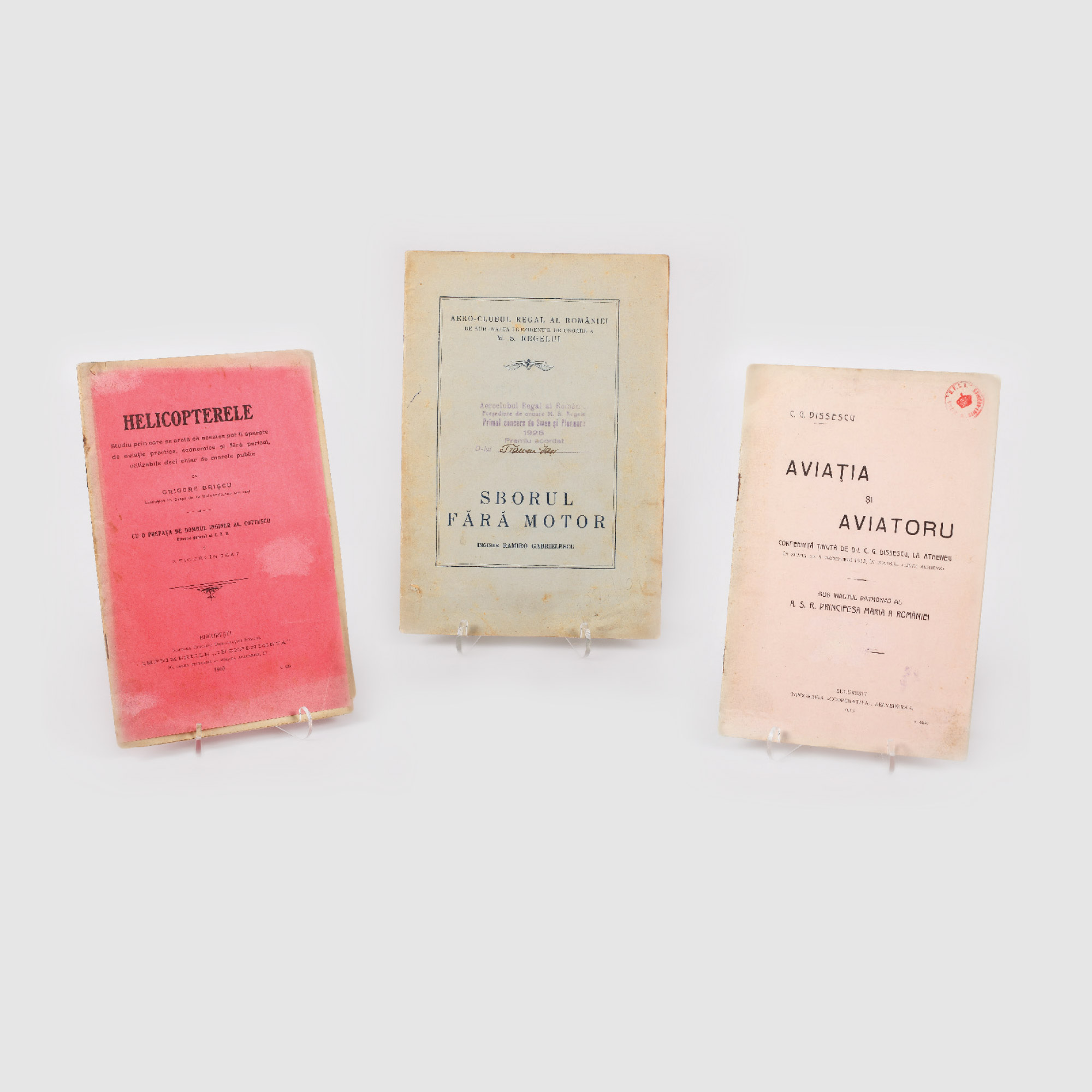 Helicopterele, Studiu prin care se arată că acestea pot fi aparate de aviație practice, economice și fără pericol, utilizabile deci chiar de marele public, de Grigore Brișcu, București 1910. Sborul fără motor, Conferință de deschidere a ciclului organizat de aeroclubul regal al României ținută la Fundația Carol I, 1 martie 1926, de inginer Ramiro Gabrielescu, București, 1926 Aviația și aviatoru, Conferință ținută de D-l C.G. Dissescu, la Atheneu, în seara de 8 decembrie 1913, în folosul "Ligei Aeriene", de C.G. Dissescu, București, 1913