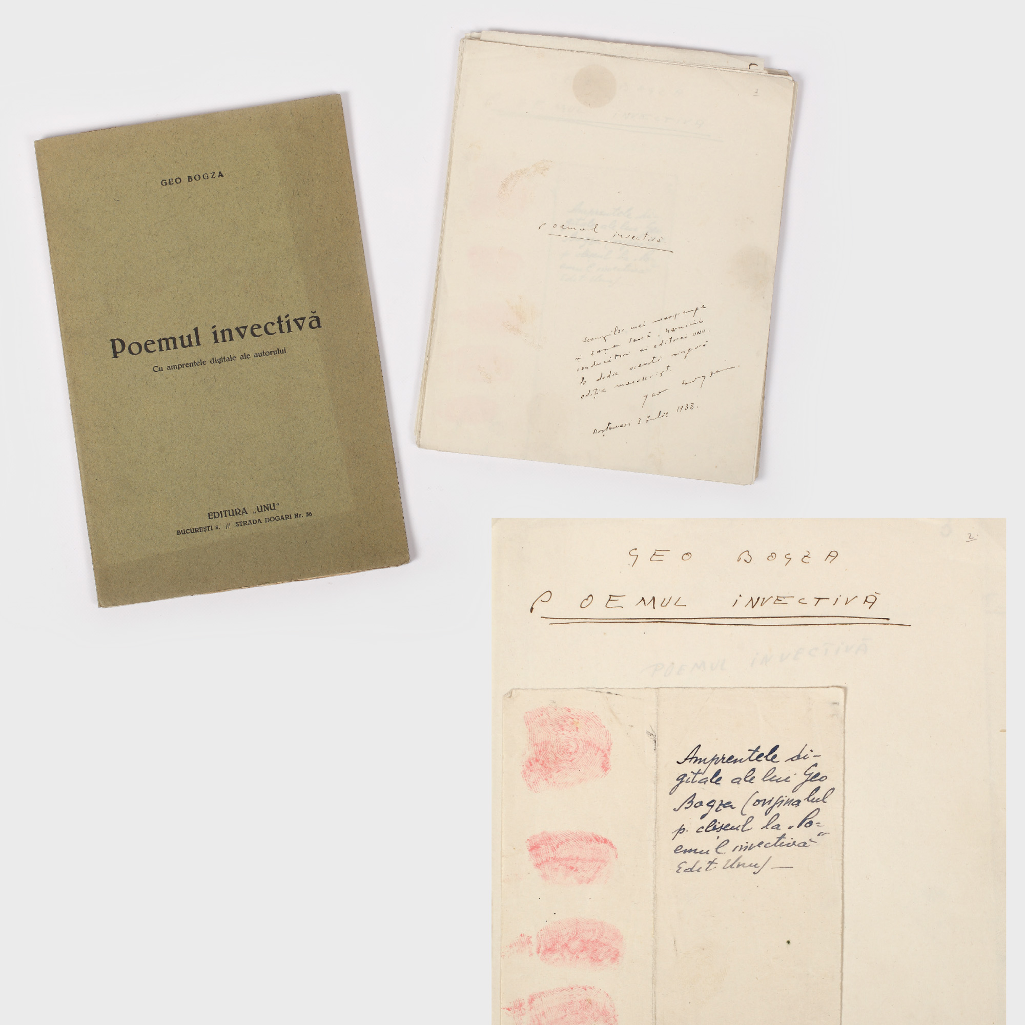 Lot de două piese unice de valoare excepţională format din: a) 53 de file manuscrise­ cu caractere de tipar ­"Poemul Invectivă" de Geo Bogza. Pe foaia de titlu se află dedicaţia: "Scumpilor mei Mary...şi Saşa Pană...conducători ai editurii UNU, le dedic această singură ediţie manuscript. Geo Bogza. 3 iulie 1933"; filele sunt păstrate într­-o copertă de carton verde; b) Volum tipărit: "Poemul Invectivă, cu amprentele digitale ale autorului"­ de Geo Bogza, Editura UNU, Bucureşti, 1933, ediţie unică originală; exemplarul 152 din 245 pe hârtie velină, 39 pg, 24 x 16 cm; volum broşat de editură, carton subţire verde; titlul pe coperta 1; netăiat.