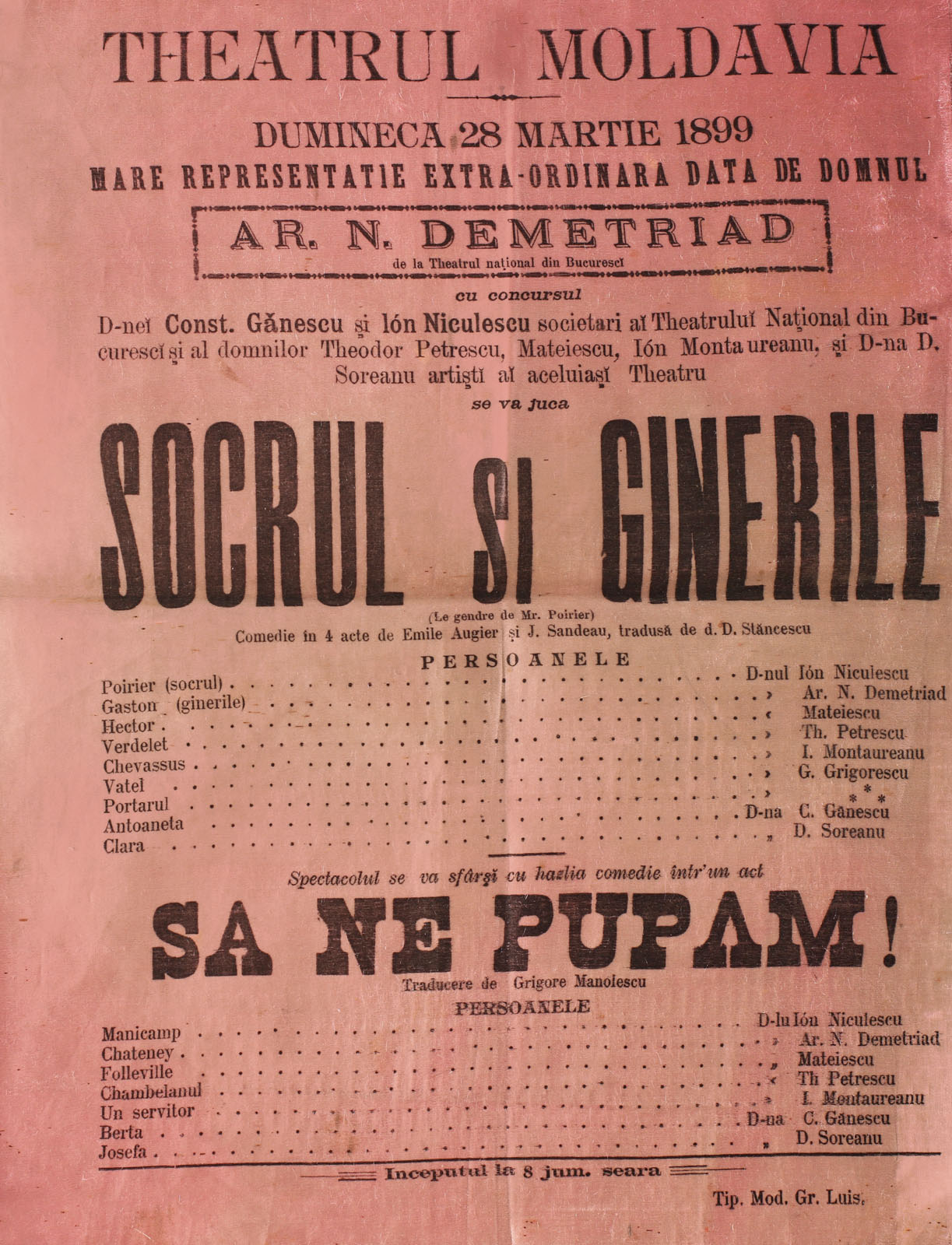 Teatrul Moldavia, trupă particulară de la sfârșitul sec. XIX, oferea spectatorilor o piesă bulevardieră inspirată după vodevilurile franțuzești foarte populare în epocă.