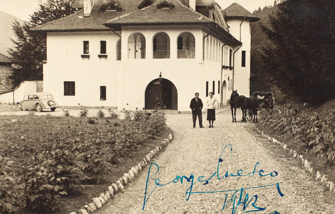 55. Fotografie cu George Enescu în faţa vilei de la Cumpătul, alături de soția Maruca Cantacuzino, cu semnătura olografă a lui George Enescu, 1942