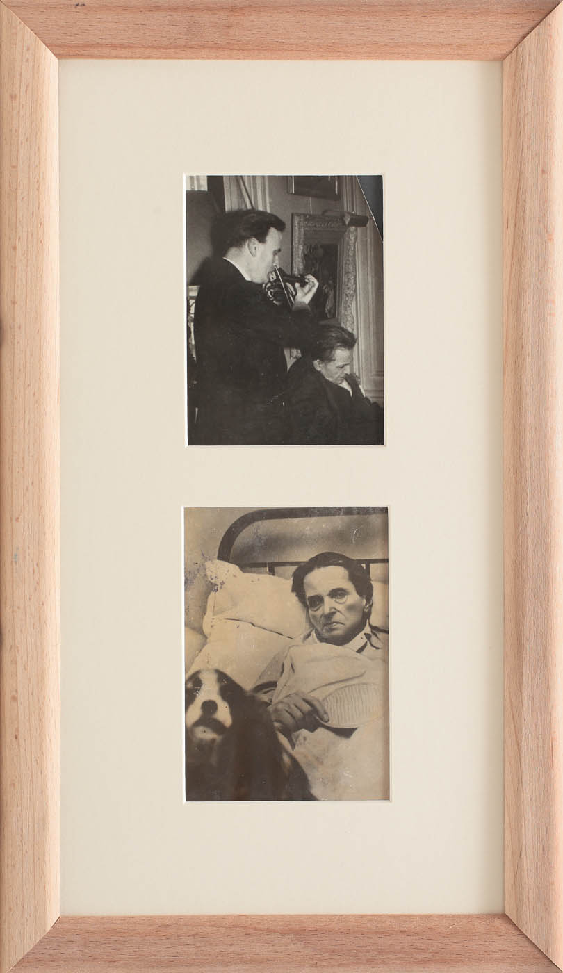 Cele două fotografii documentează ultima parte a vieții muzicianului român, aflat la Paris, avându-l alături pe Yehudi Menuhin, elevul și discipolul său, care încerca să-l bucure cântând la vioară. Mare iubitor de animale, pe care le-a avut permanent în preajmă, Enescu era însoțit și atunci de companionul său.