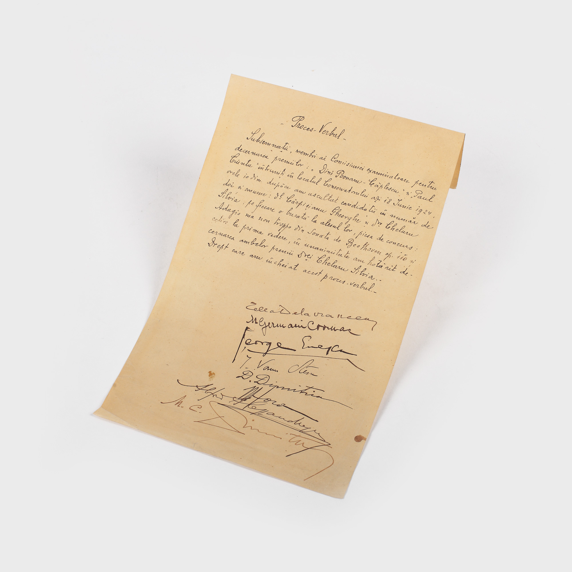 O comisie formată din opt membri, printre care George Enescu, Cella Delavrancea, D. Dimitrie, Alfred Alessandrescu, Mihail Jora, era numită la Conservatorul Național de Artă din București pentru acordarea unei burse de studii sub forma unui premiu. Documentul, redactat de mână, cuprinde semnăturile olografe ale membrilor juriului.