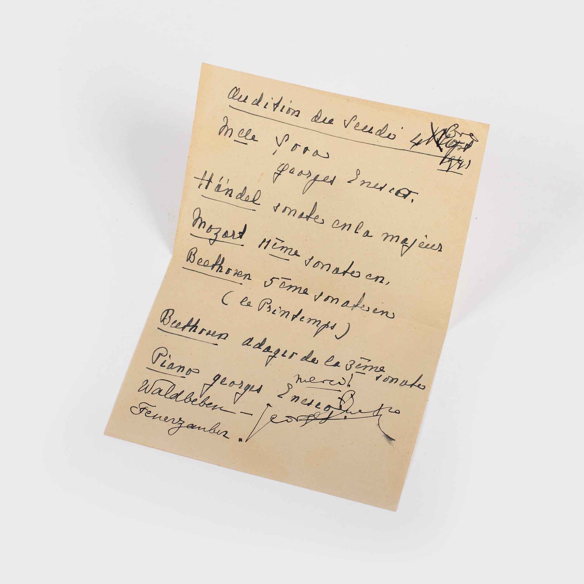 George Enescu cu schița de mână planul unui concert care urma să aibă loc la 4 septembrie 1941, cu el solist la pian. Schița era întărită prin semnătura sa și mulțumirile aduse probabil organizatorilor.