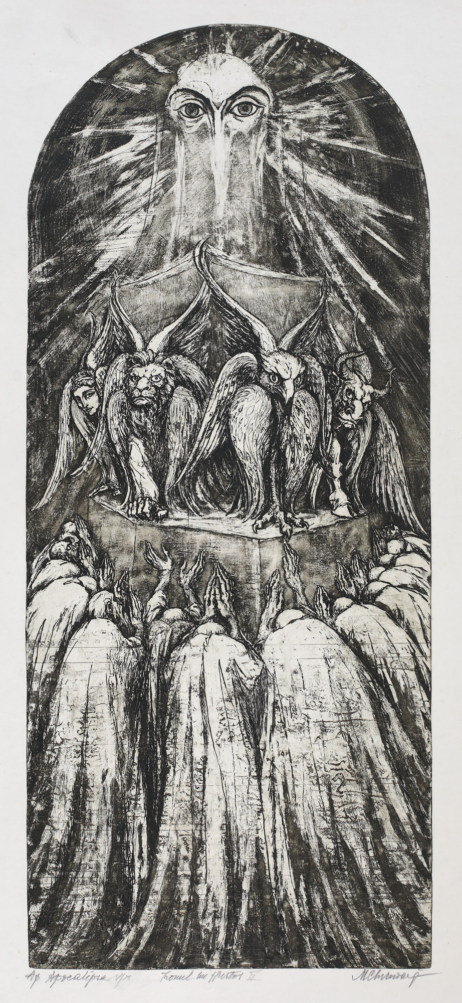 semnat dreapta jos, în creion, "M. Chirnoagă"; notat, intitulat și numerotat stânga jos, în creion, "Ap. Apocalipsa, V/X, Tronul lui Hristos II"