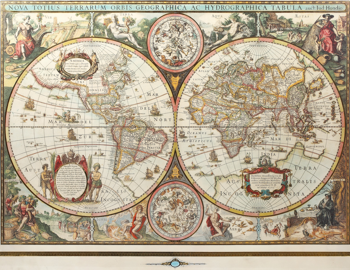 159. Frumoasă reproducere a hărții ”Nova Totius Terrarum Orbis Geographica Ac Hydrographica Tabula”, de Hondius, 1617 [a doua jumătate a sec. XX]