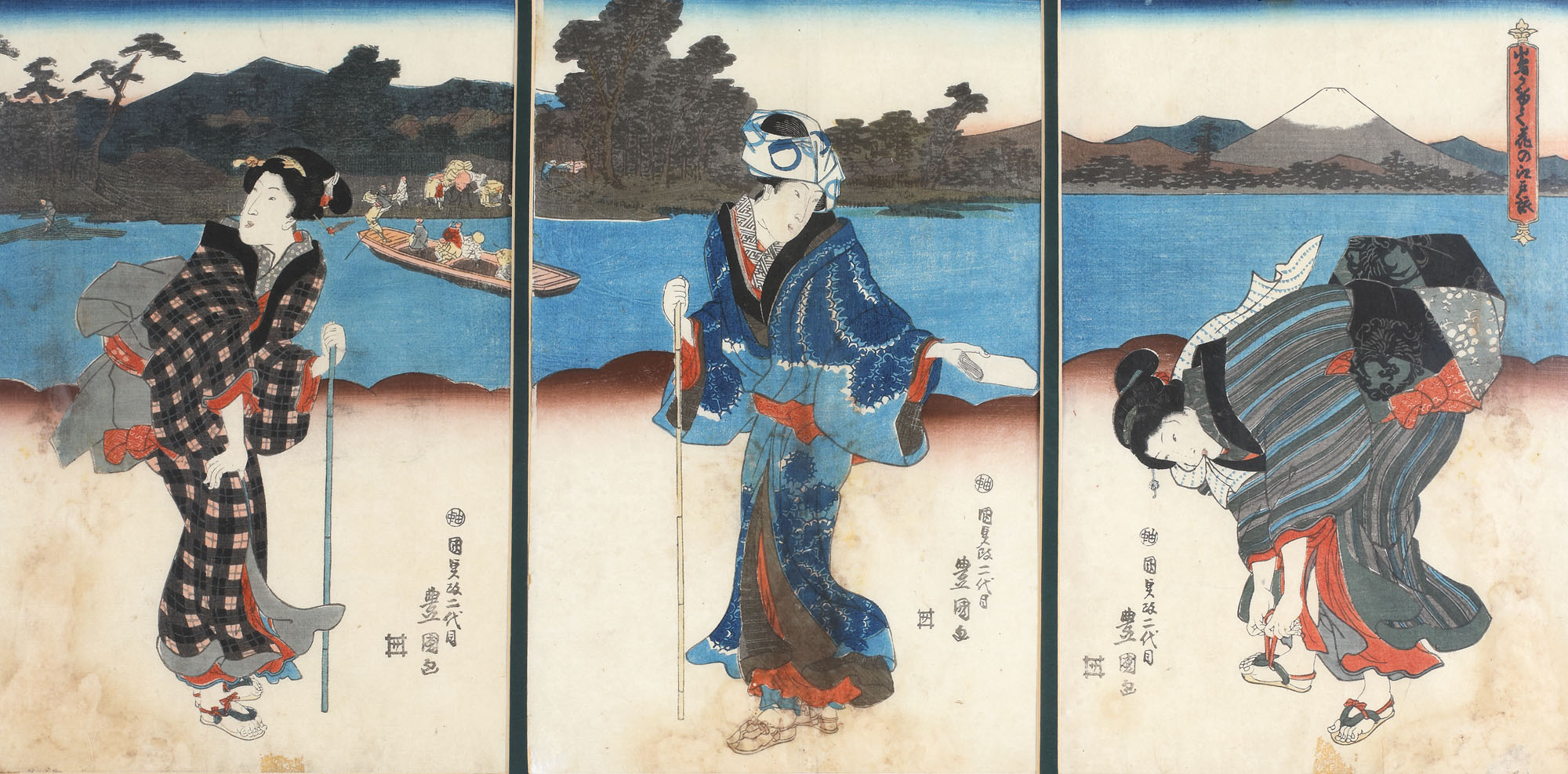 A. semnat dreapta jos, ”Toyokuni ga”; B. semnat central jos, ”Toyokuni ga”; C. semnat dreapta jos, ”Toyokuni ga”
