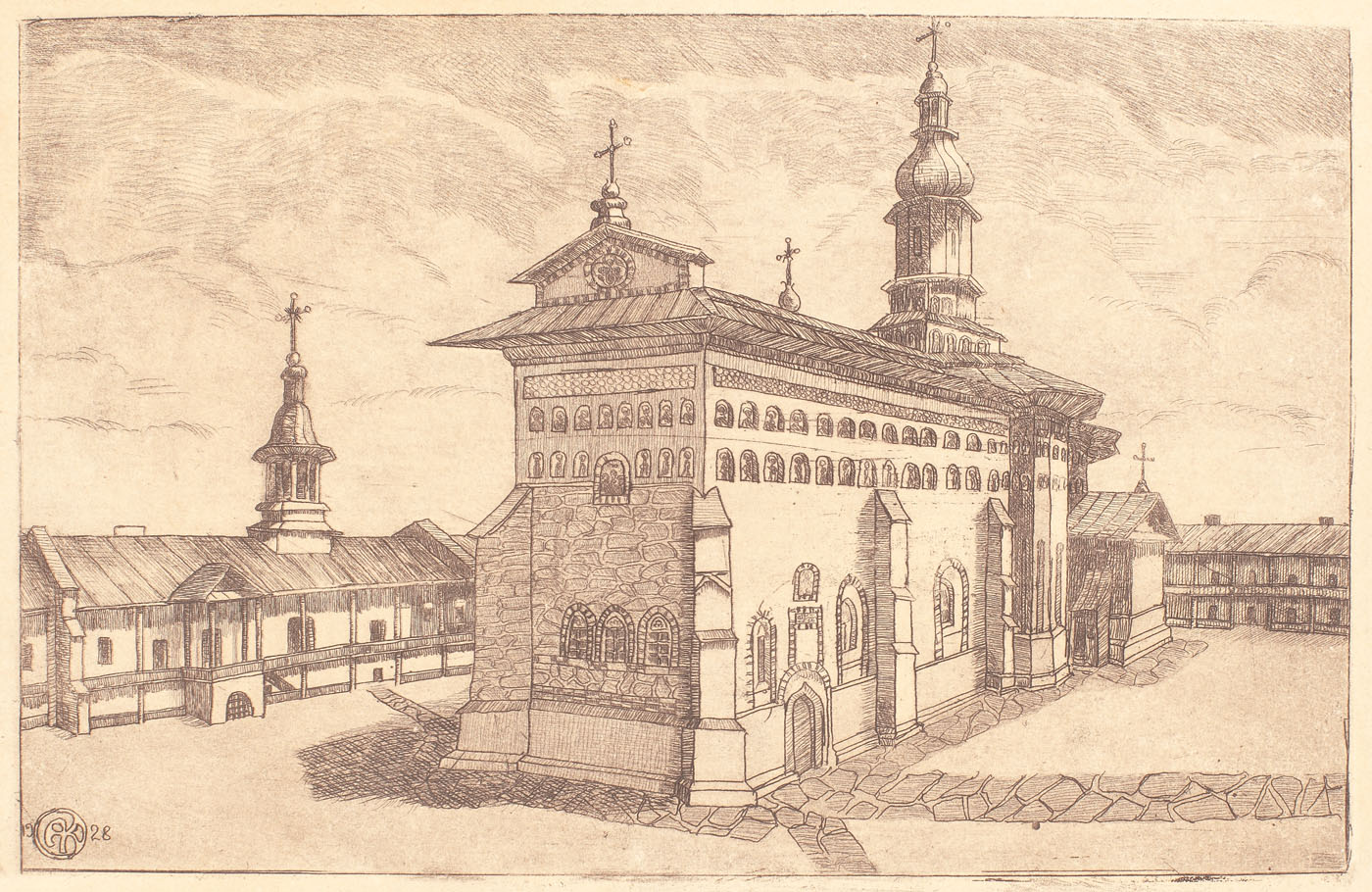 semnat și datat dreapta jos, în creion, "Anton Kaindl, 1929"; localizat stânga jos, în creion, "M-rea Neamțu"; semnat și datat stânga jos, gravat, în monogramă, "AK, 1928"