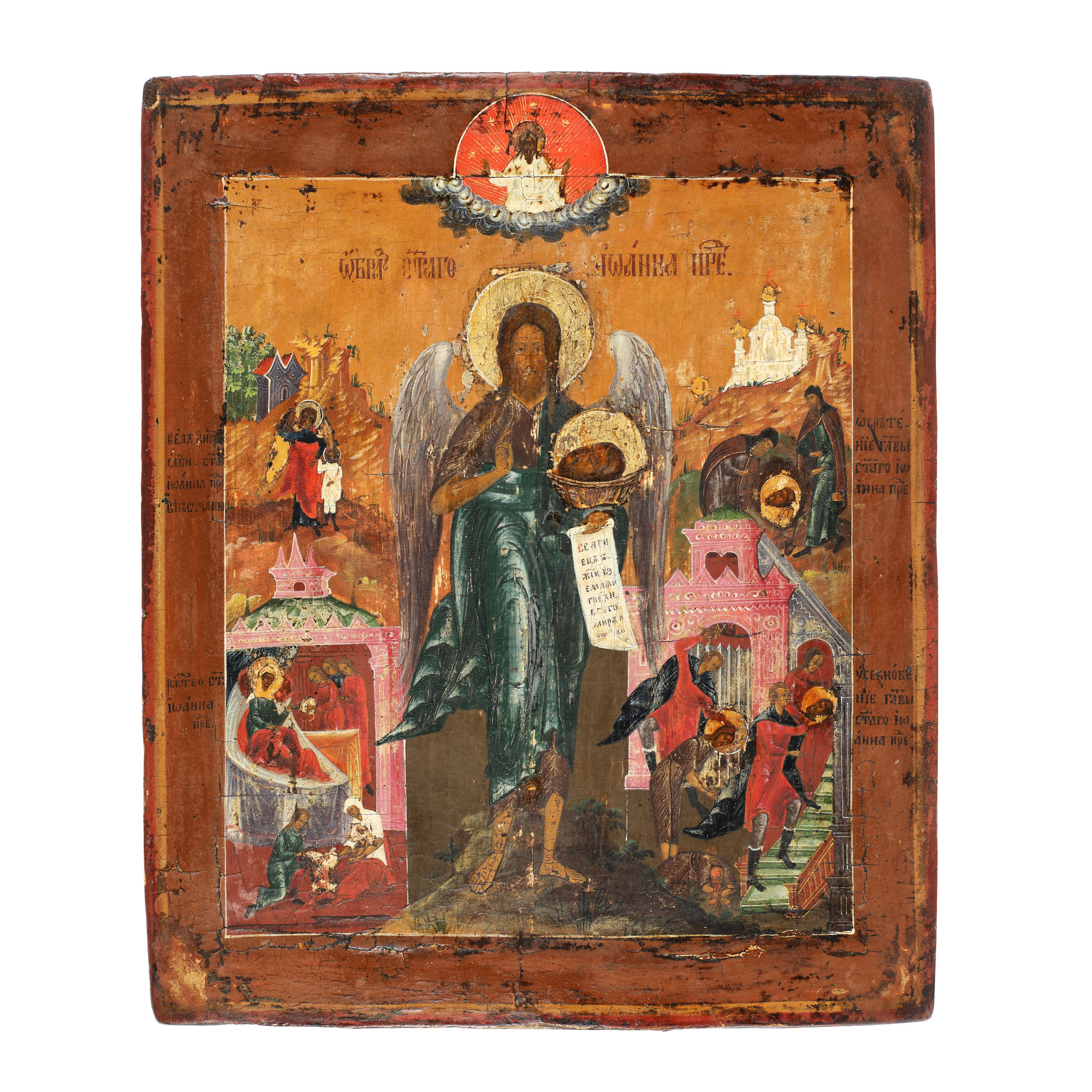 54. Icoană pe lemn, ”Sfântul Ioan Botezătorulul - Îngerul deșertului cu scene din viața sa”, școală rusească (Palekh), sfârșitul sec. XVIII - începutul sec. XIX