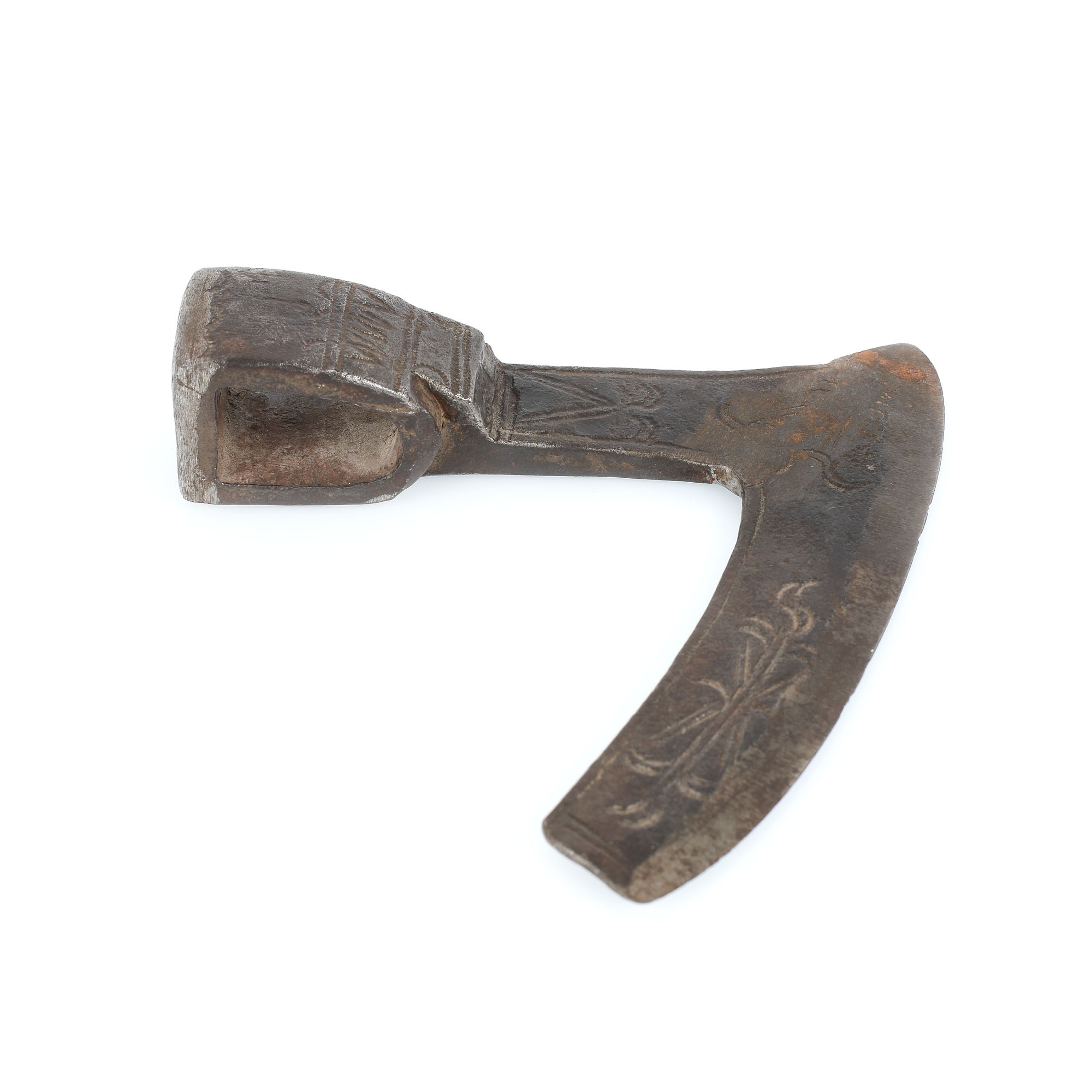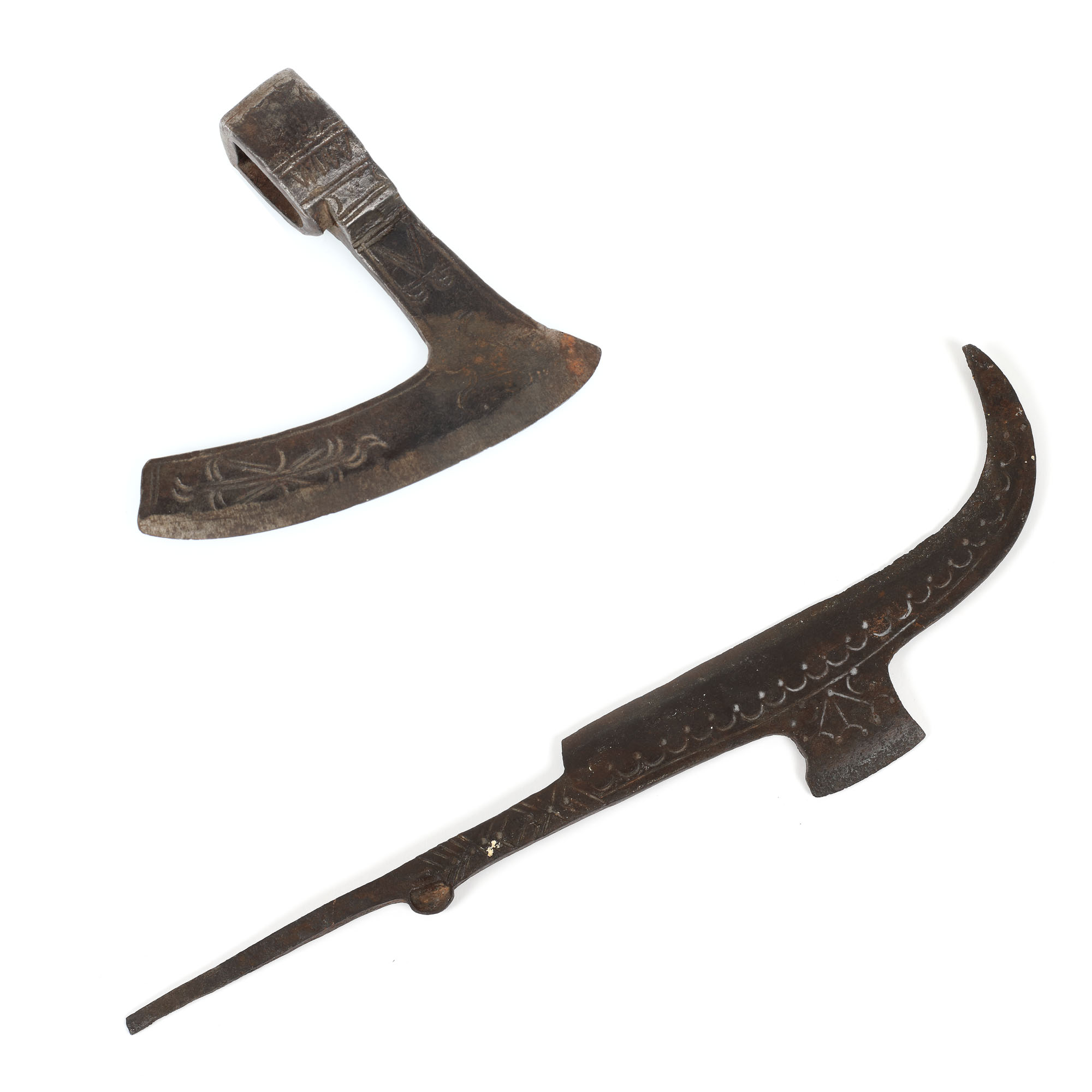 68. Lot de arme populare decorate, compus din bardă din bronz și coasă de luptă, gravate cu motive geometrice și simboluri, Transilvania, sec. XIX