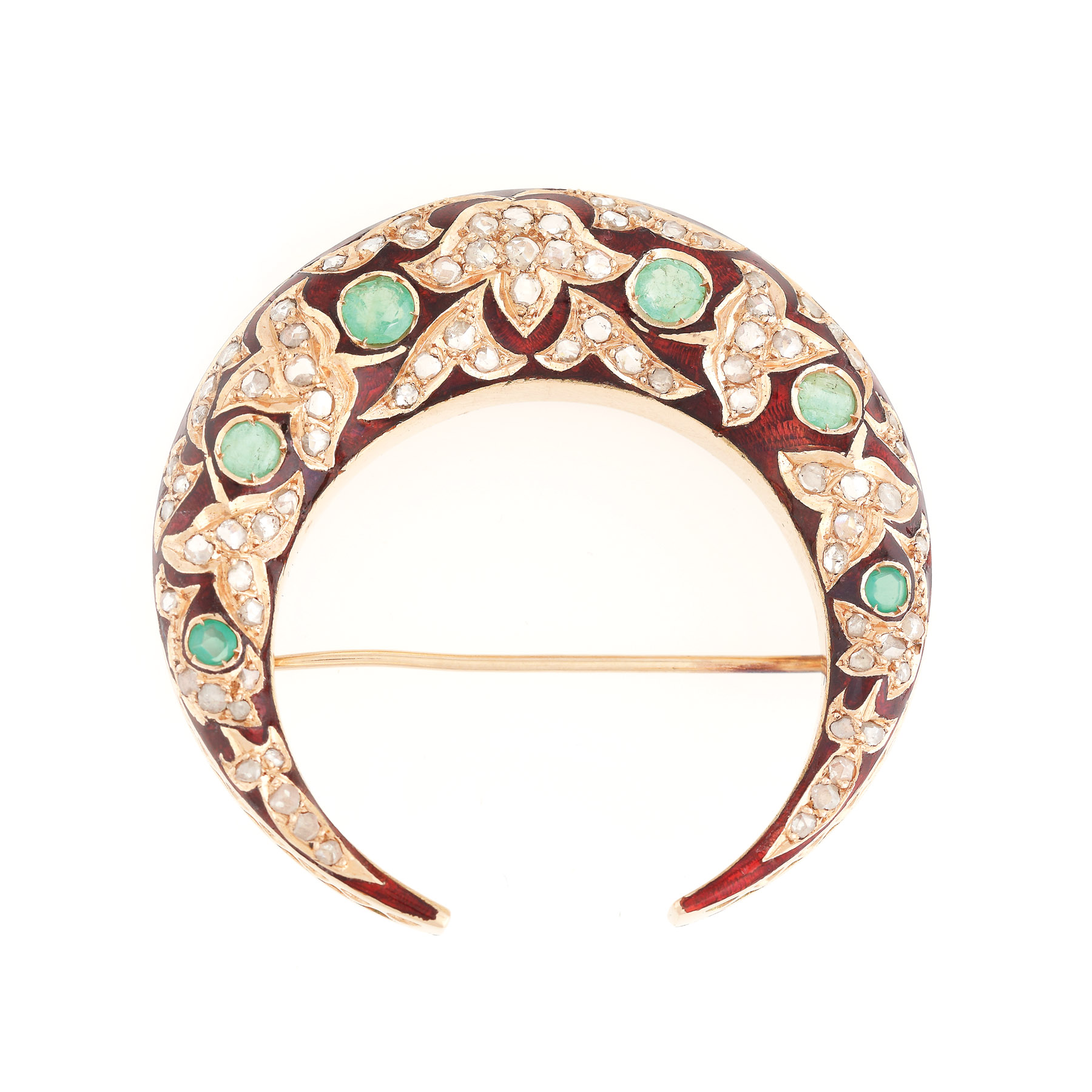 219. Broșă din aur roz, în formă de semilună, decorată cu multitudine de diamante, smaralde și email