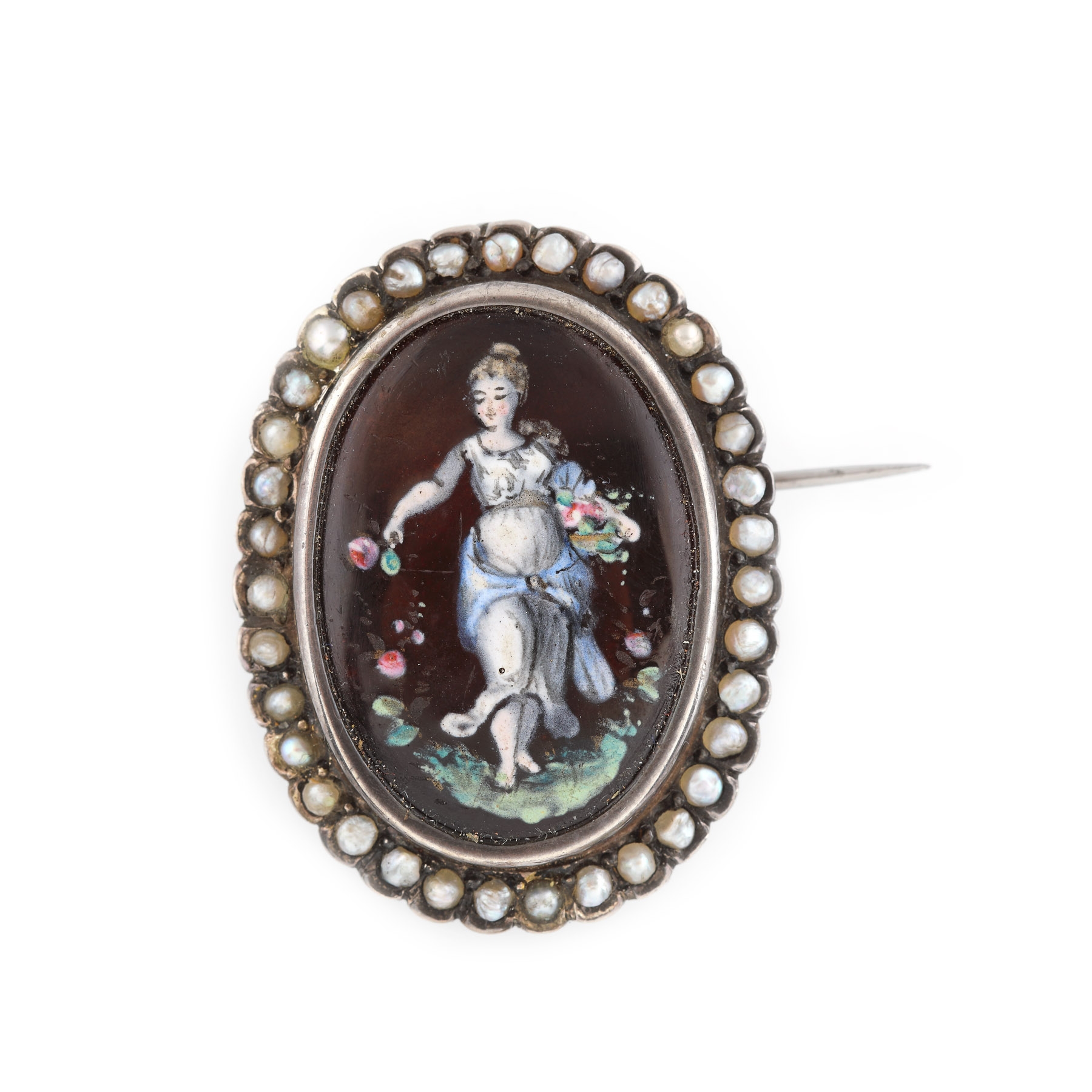 237. Broșă victoriană, pictată manual cu email și mărginită de perle