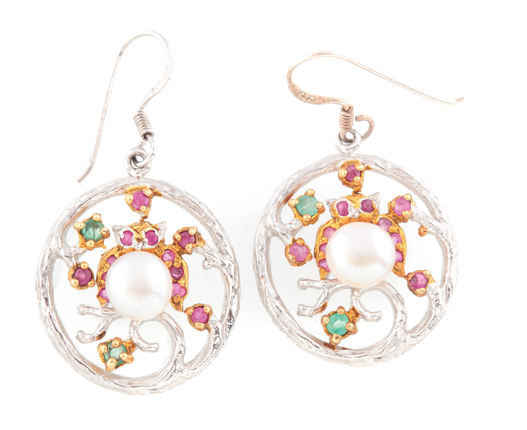 249. Pereche de cercei din argint aurit, decorată cu perle, rubine și smaralde