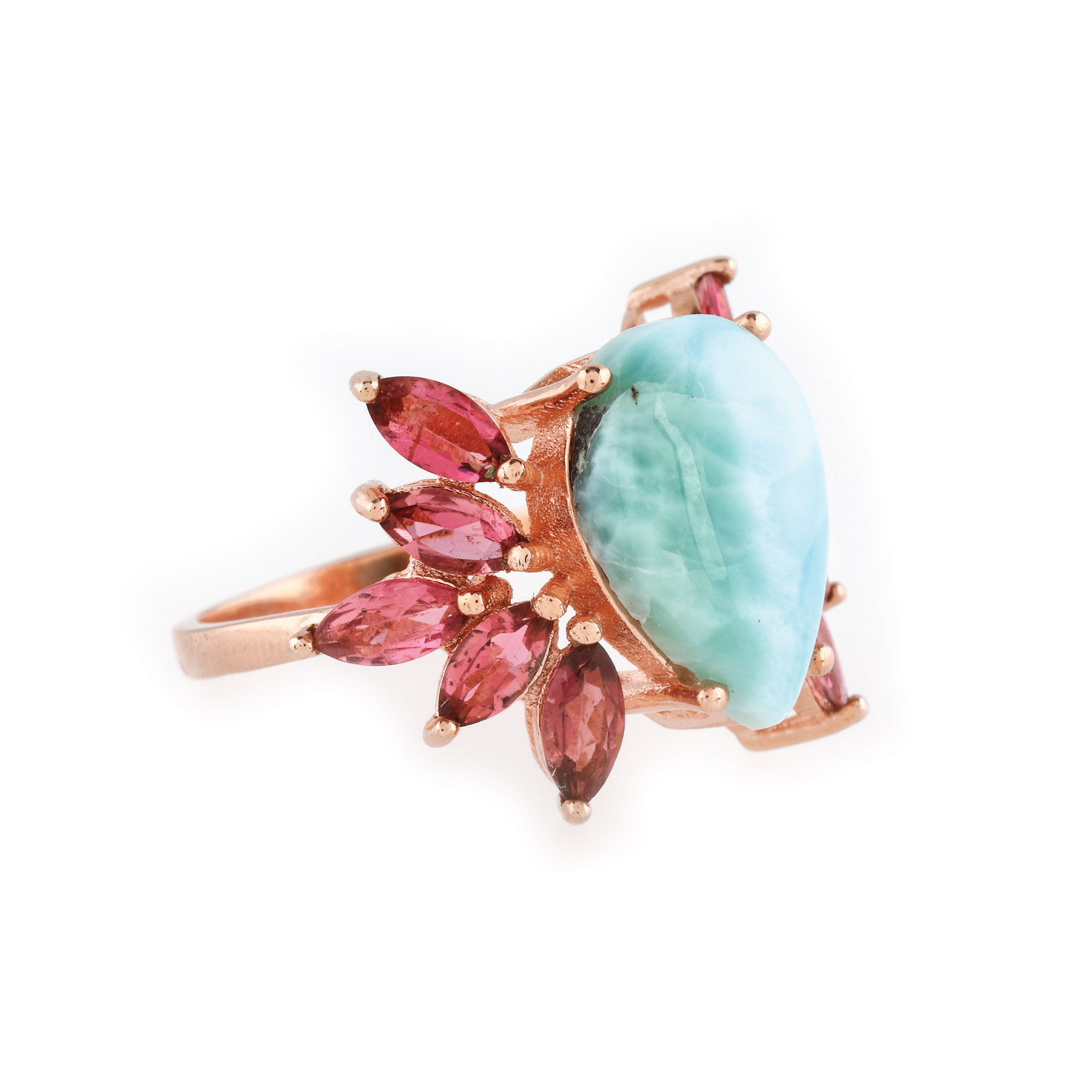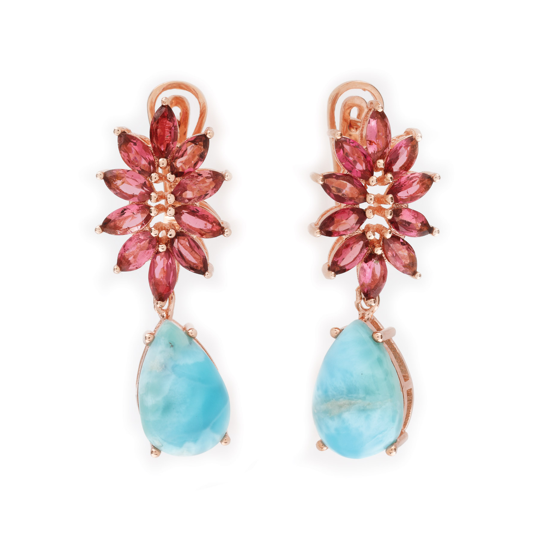 3 pectolite pară caboșon, culoare bleu, cca. 19,0 ct. și 30 rodolite marchiz fațetate, culoare roșu-violet, claritate eye-clean, cca. 6,0 ct.