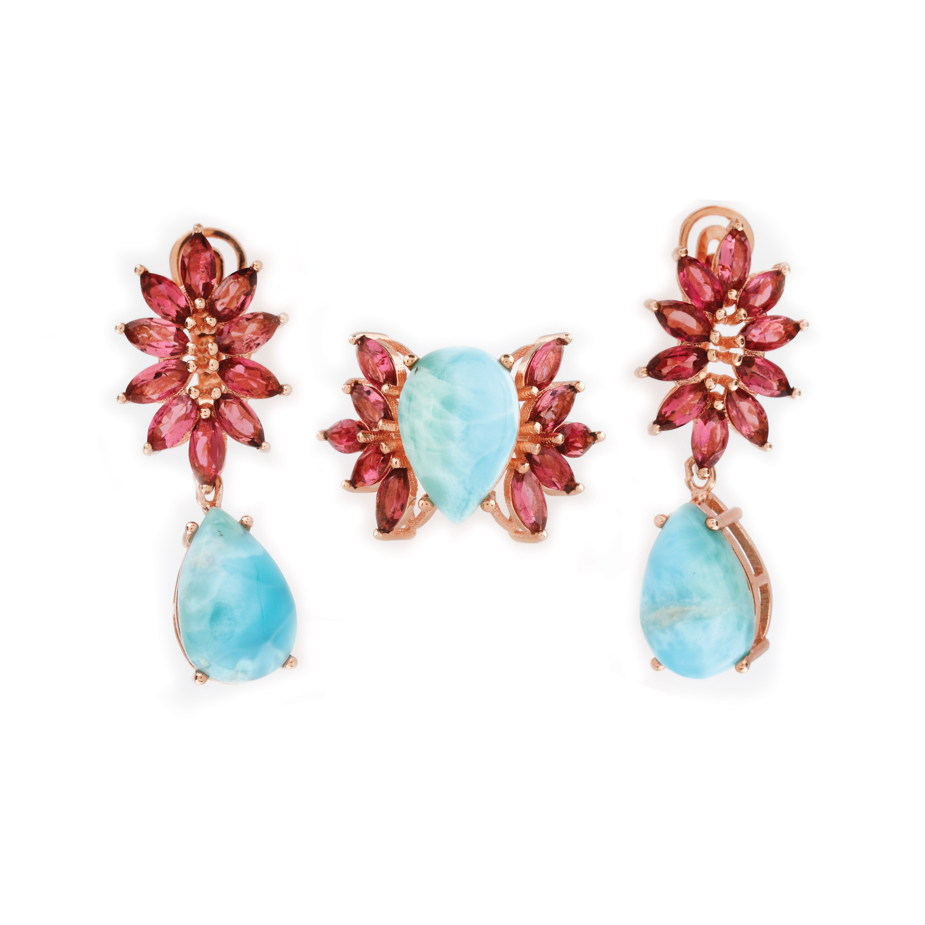 273. Set din argint aurit, format din pereche de cercei și inel, decorat cu pectolite și rodolite