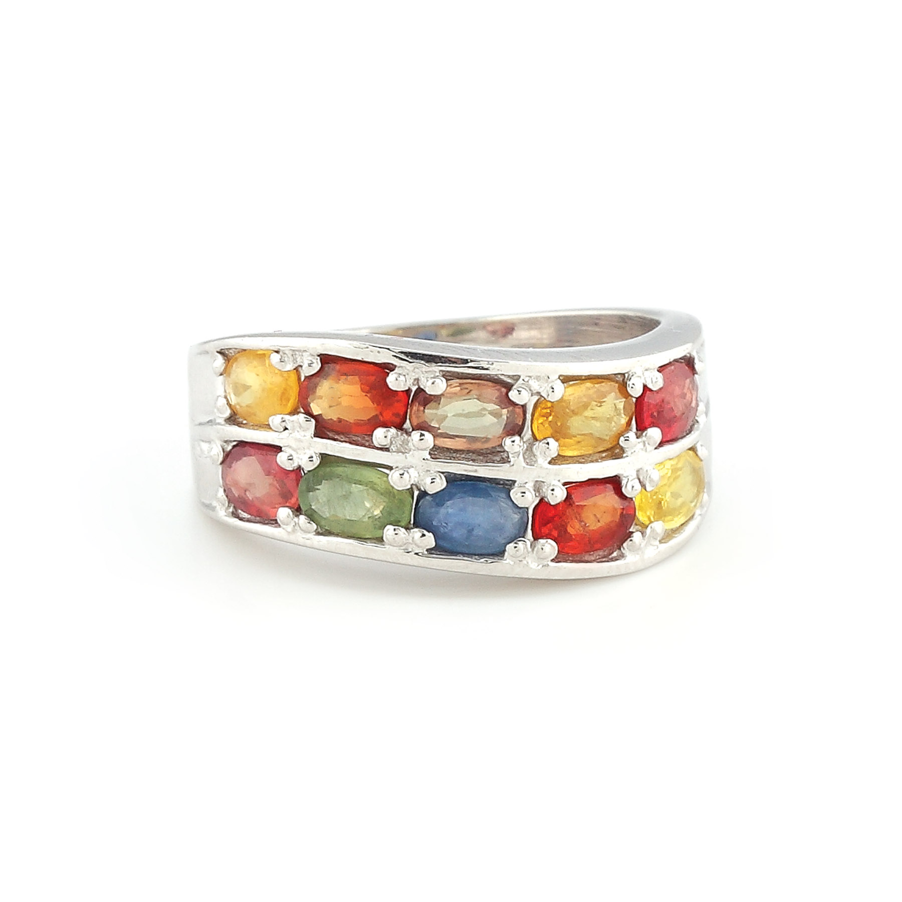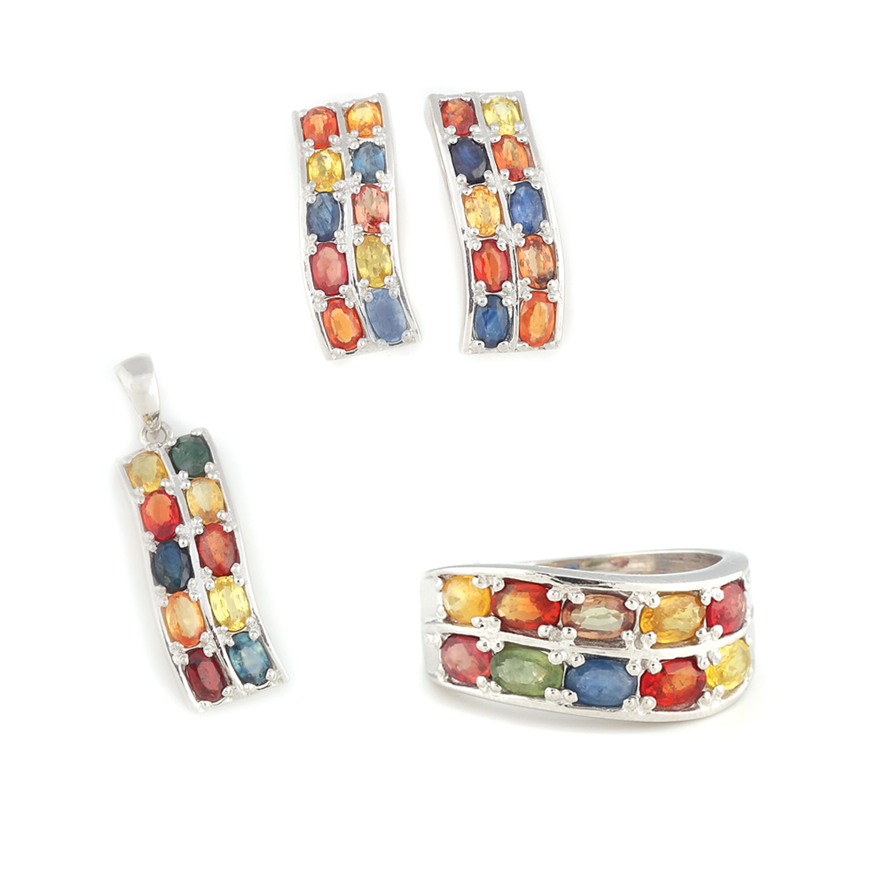 cercei: 29 safire muticolore (culori: portocaliu, roz, albastre, galbene) cca. 4.8 ct., pandantiv: 10 safire (1 portocaliu, 3 galbene, 1 safir verde, 3 roz, 2 albastre) cca. 2.4 ct., inel: 10 safire multicolore (3 roz, 2 portocalii, 3 galbene, 1 albastru, 1 verde) cca. 2.4 ct.