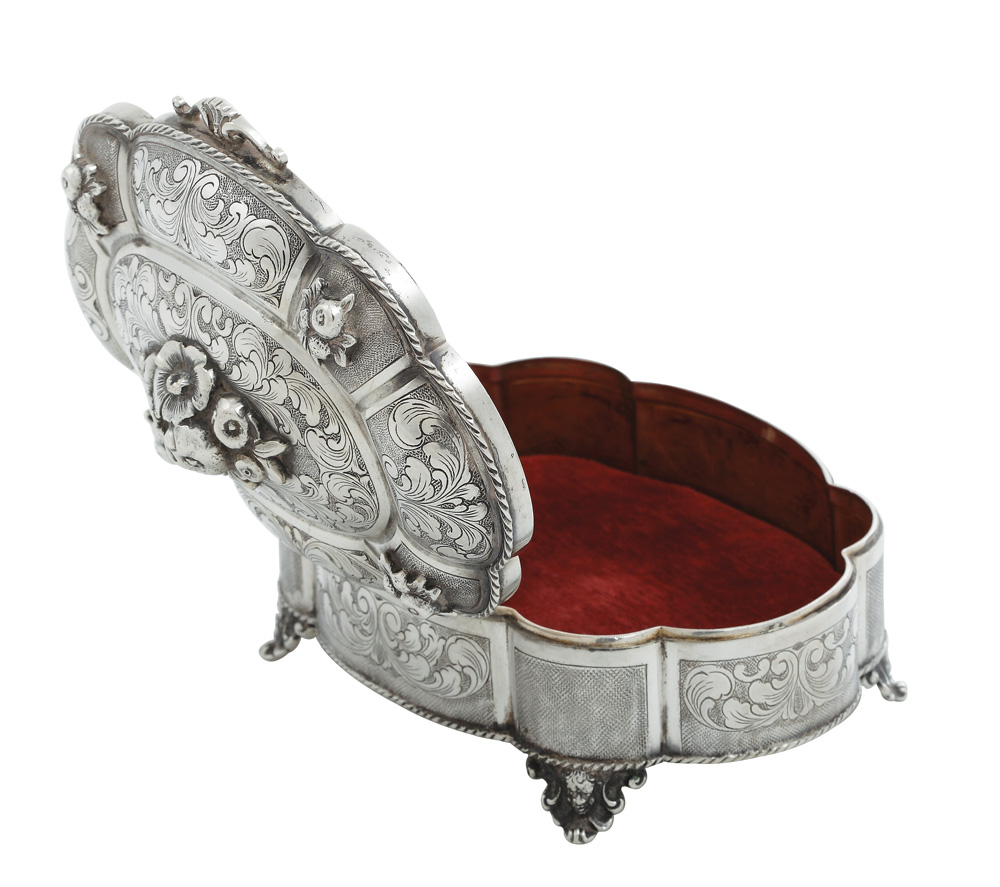 139. Casetă de bijuterii din argint, decorată cu buton floral, cca 1934