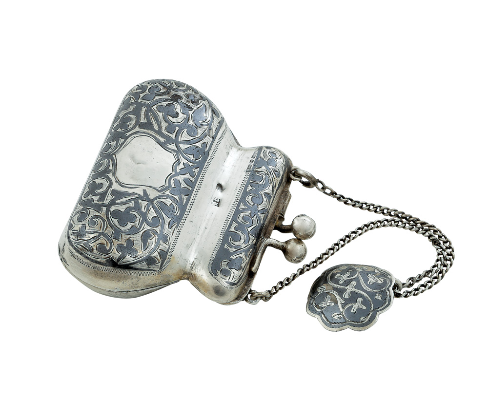 Porte-monnaie-ul din argint, de formă violonată și bombată inferior, este compus din două elemente îmbinate prin șarnieră și închizător, acționat de un sistem de elemente sferice încrucișate. Suprafețele sunt decorate cu motive vegetale stilizate în niello. Pe una din feţe regăsim un scut heraldic cu rezervă pentru monogramă, iar pe partea opusă inscripţia “KAVKAZ”. Portmoneul este prevăzut cu un lănţişor.