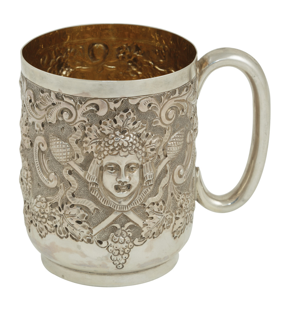 78. Cană din argint Elkington, decorată cu efigia lui Bacchus şi motive vegetale, 1922