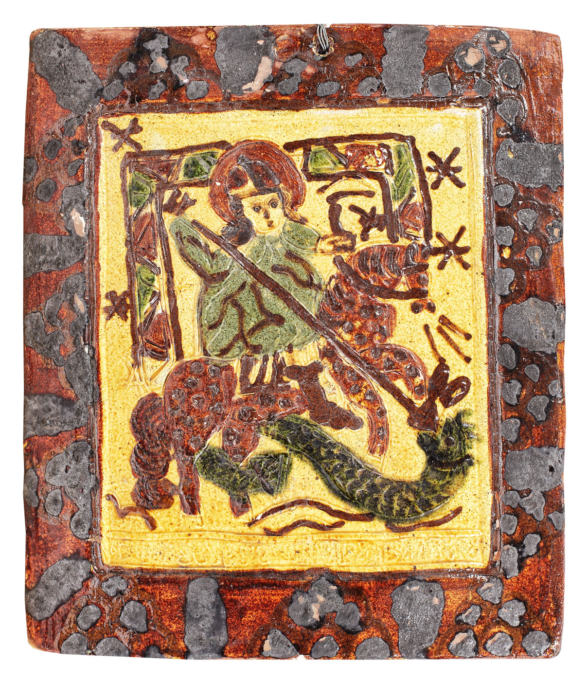 48. Cahlă pictată, ”Sfântul Gheorghe ucigând balaurul”, sec. XX, provine din colecția Marga și Eugen Barbu