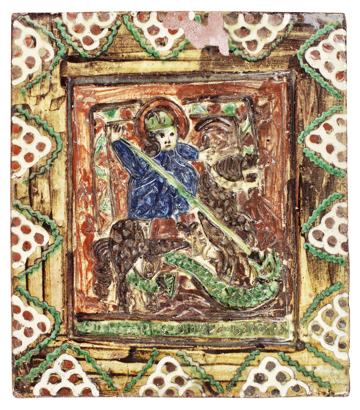 49. Cahlă pictată, ”Sfântul Gheorghe ucigând balaurul”, sec. XX, provine din colecția Marga și Eugen Barbu