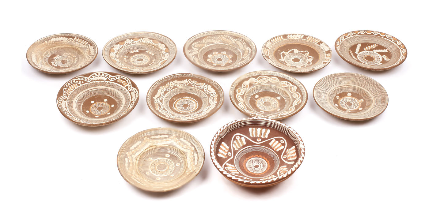 61. Lot de unsprezece farfurii decorate cu motive populare, ceramică de Horezu, sec. XX, provine din colecția Marga și Eugen Barbu