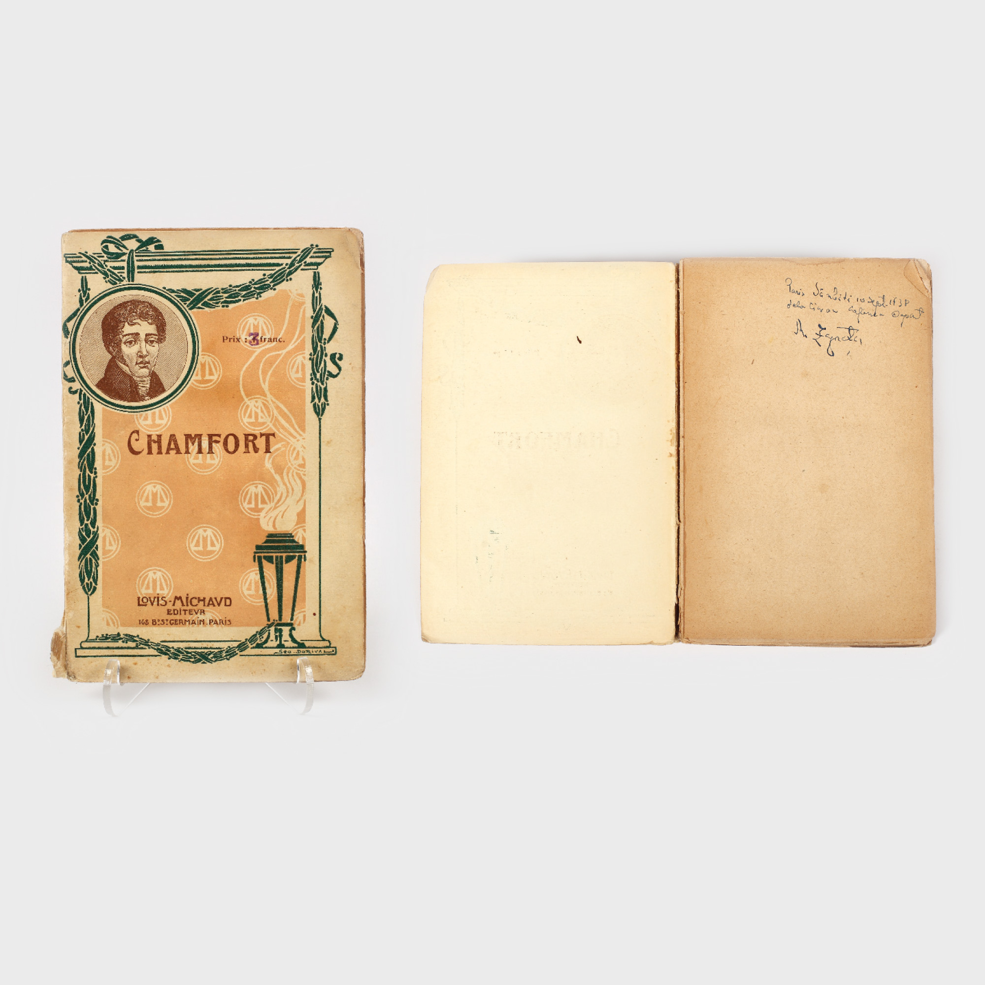 "Chamfort", texte alese de Charles Simond, editura Louis-Michaud Paris, 1934, legătură originală semnată Geo Dorival. Pe forzaț se găsește însemnarea manuscrisă "Paris, sâmbătă 10 septembrie 1934, de la Cioran", semnată indescifrabil.