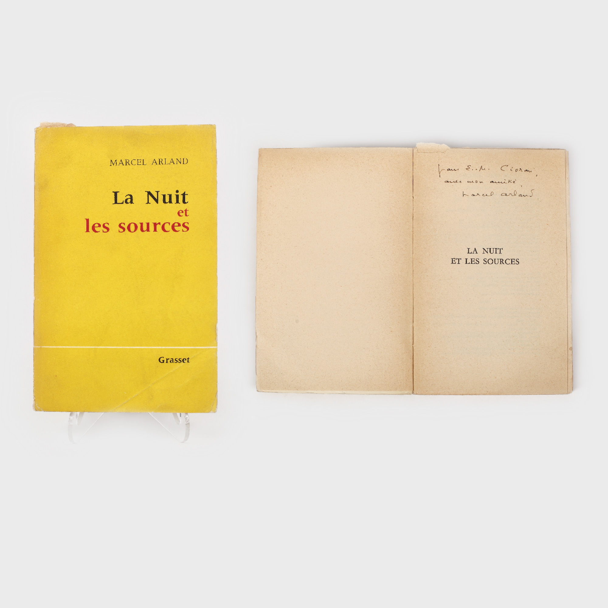 "Le nuit et les sources", editura Grasset Paris, 1953. Pe fila pe care se află titlul există dedicația manuscrisă a autorului: "Fam. E. M. Cioran, avec mon amitie" și semnătura olografă Marcel Arland.