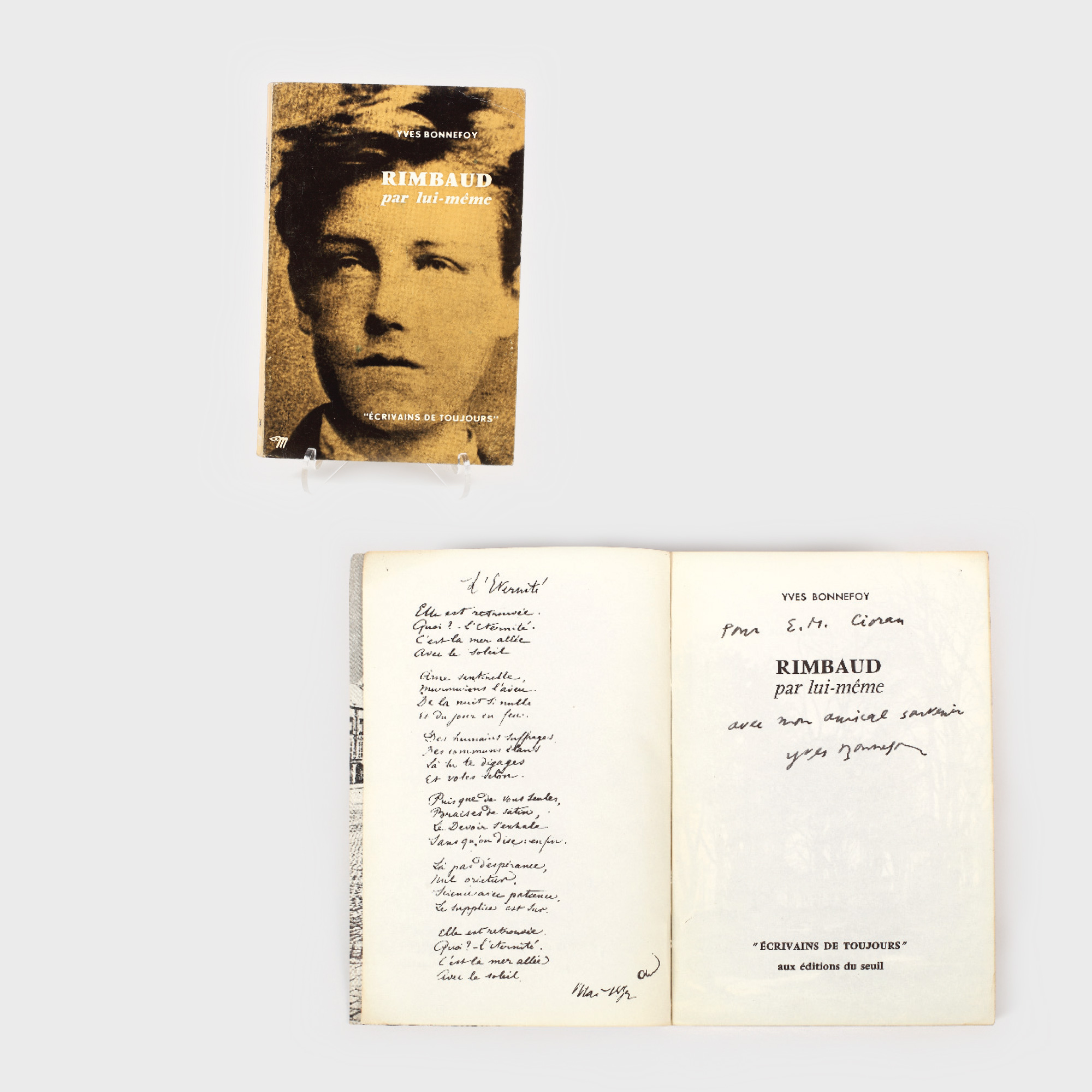"Rimbaud par lui-meme", de Yves Bonnefoy, editura Seuil, colecția Ecrivants de Toujours. Între ilustrații se găsește și o caricatură a lui Baudelaire făcută de Verlaine. Dedicația manuscrisă "Pour E. M. Cioran, avec mon amical souvenir" este semnată Yves Bonnefoy.