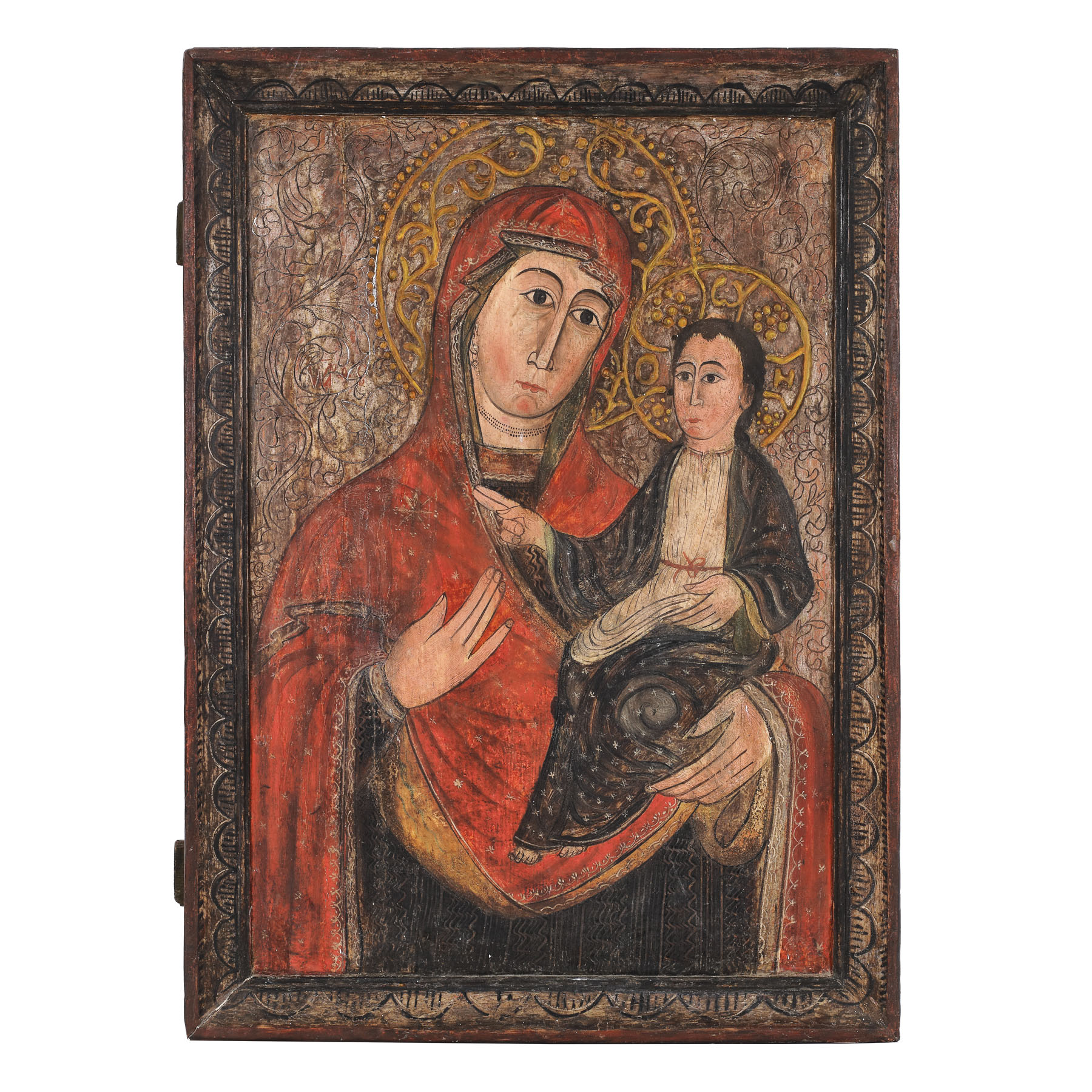 386. Icoană împărătească pe lemn, ”Maica Domnului cu Pruncul” (Hodighitria), ramă pictată, școală transilvăneană, a doua jumătate a sec. XVIII