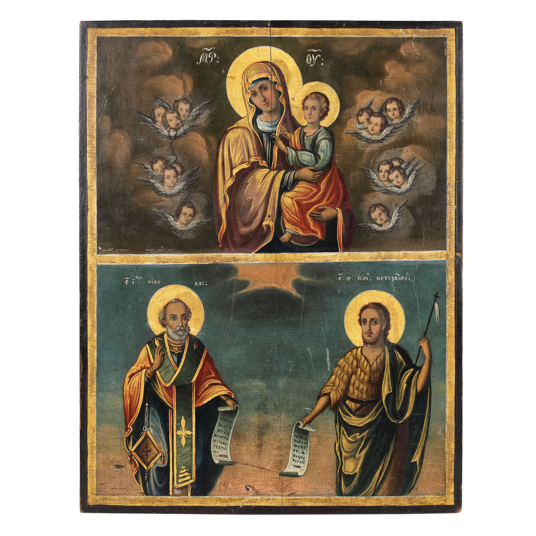 388. Icoană pe lemn, în două registre, ”Maica Domnului cu Pruncul, Sfântul Nicolae și Sfântul Ioan Botezătorul”, zugrav Teodor, școală românească, 19 mai 1848