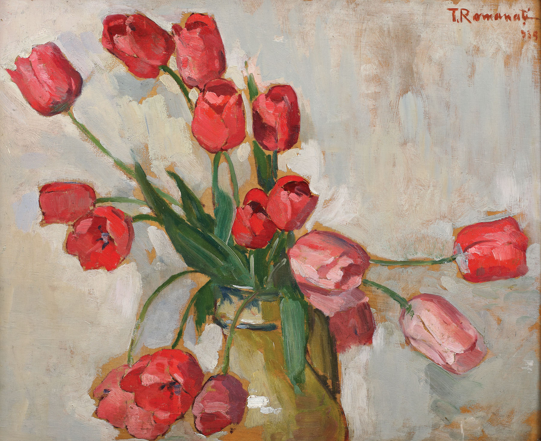 semnat și datat dreapta sus, cu brun, "T. Romanați, (1)939"