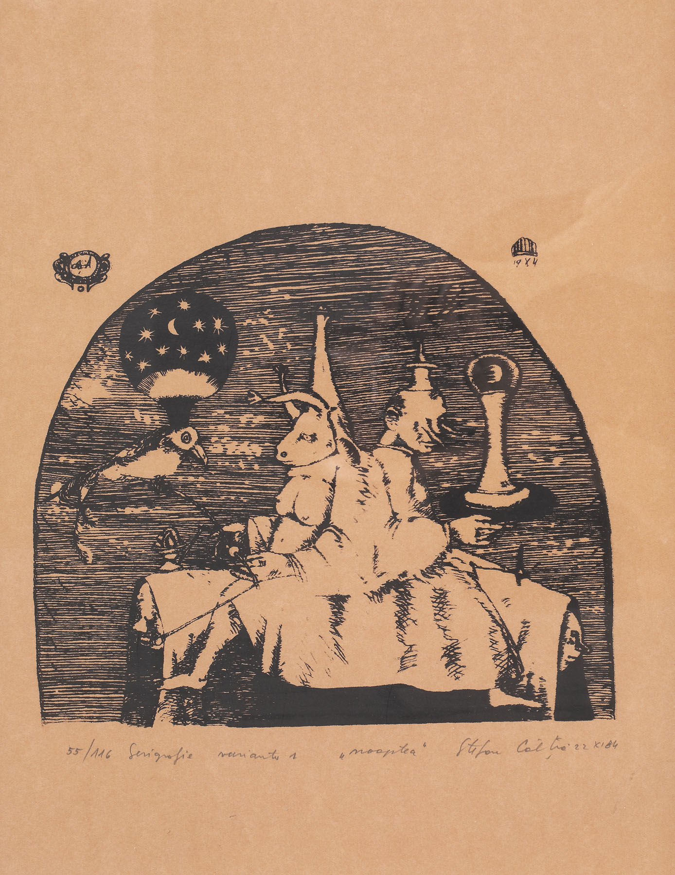 semnat, datat, intitulat și numerotat central jos, în creion, "Ștefan Câlția, 20 XI 1994, Noaptea, Varianta I, 55/116"