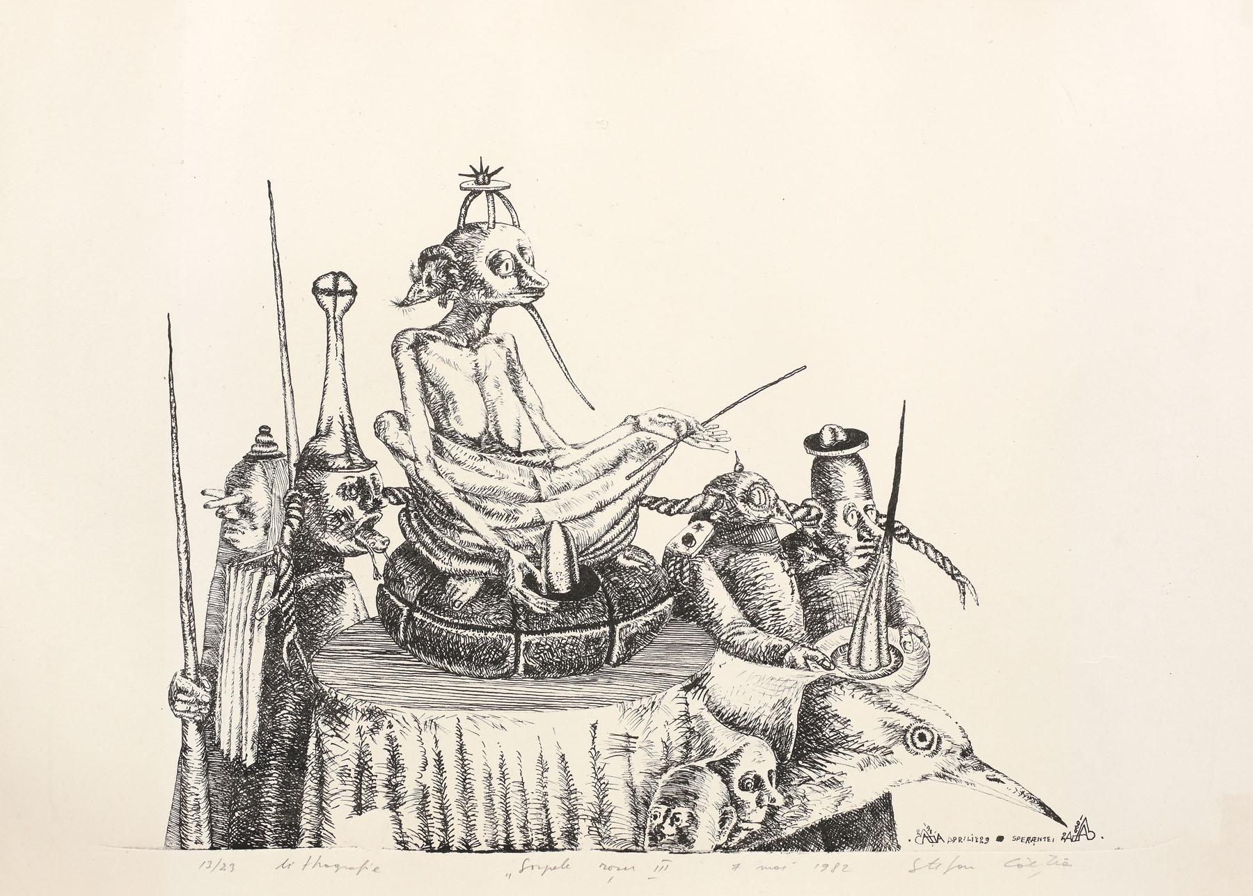 semnat, datat și intitulat, numerotat dreapta jos, sub cadru, în creion, "Ștefan Câlția, Șarpele roșu III, 7 Mai 1982”; numerotat stânga jos, sub cadru, în creion, ”13/23"