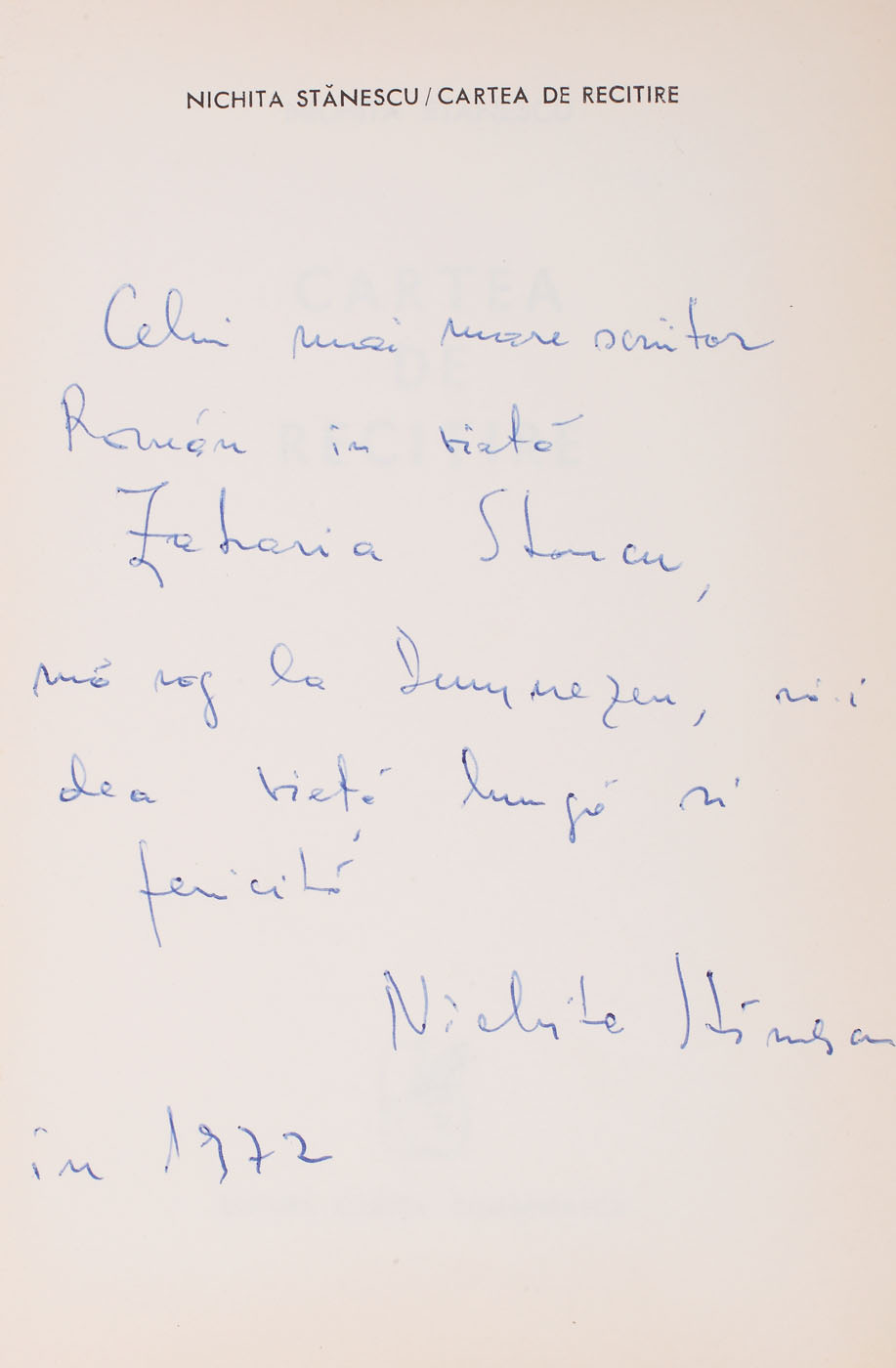 40. "Cartea de recitire", de Nichita Stănescu, Bucureşti, 1972, cu dedicaţia autorului către Zaharia Stancu
