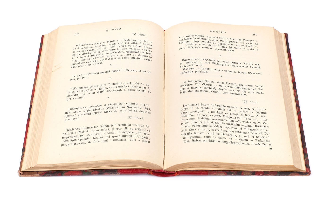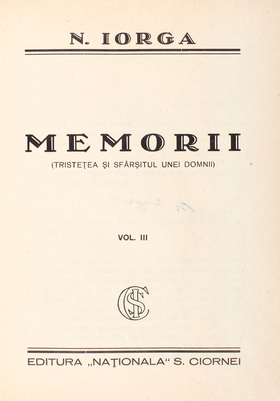 62. "Memorii", de Nicolae Iorga, vol. III, Bucureşti, 1931, cu semnătura olografă a autorului